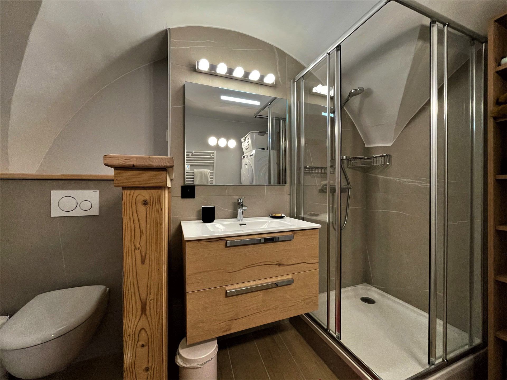 Bathroom: washbasin, italian shower, heated towel rail, hair dryer