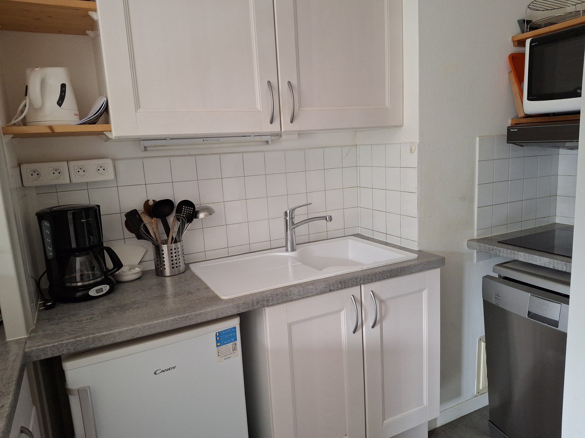 Kitchen area with vitroceramic hobs, oven, fridge, coffeepot.
