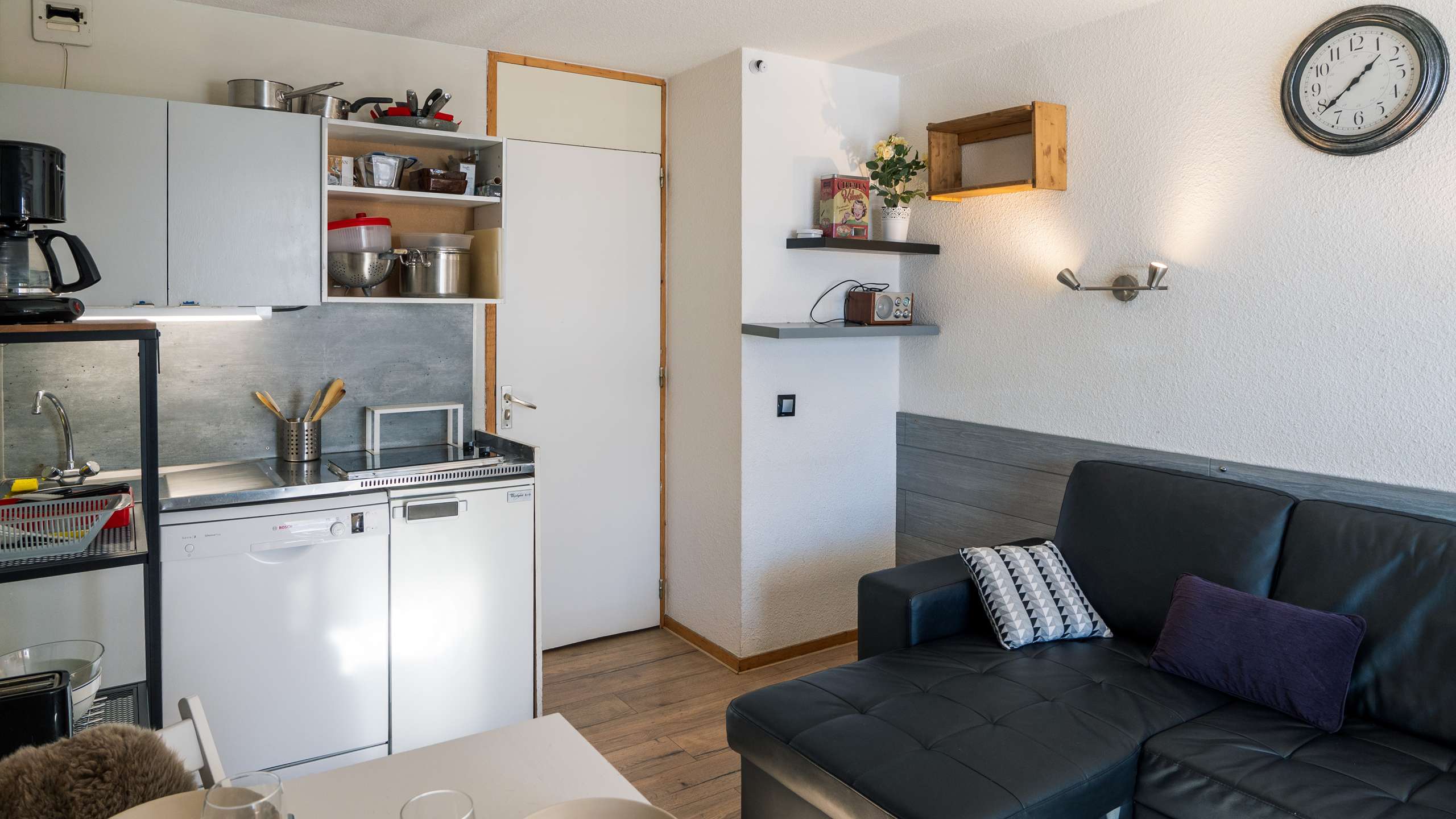 - Description: Kitchenette equipped with ceramic hobs, dishwasher, fridge, Nespresso coffee machine, toaster and kettle