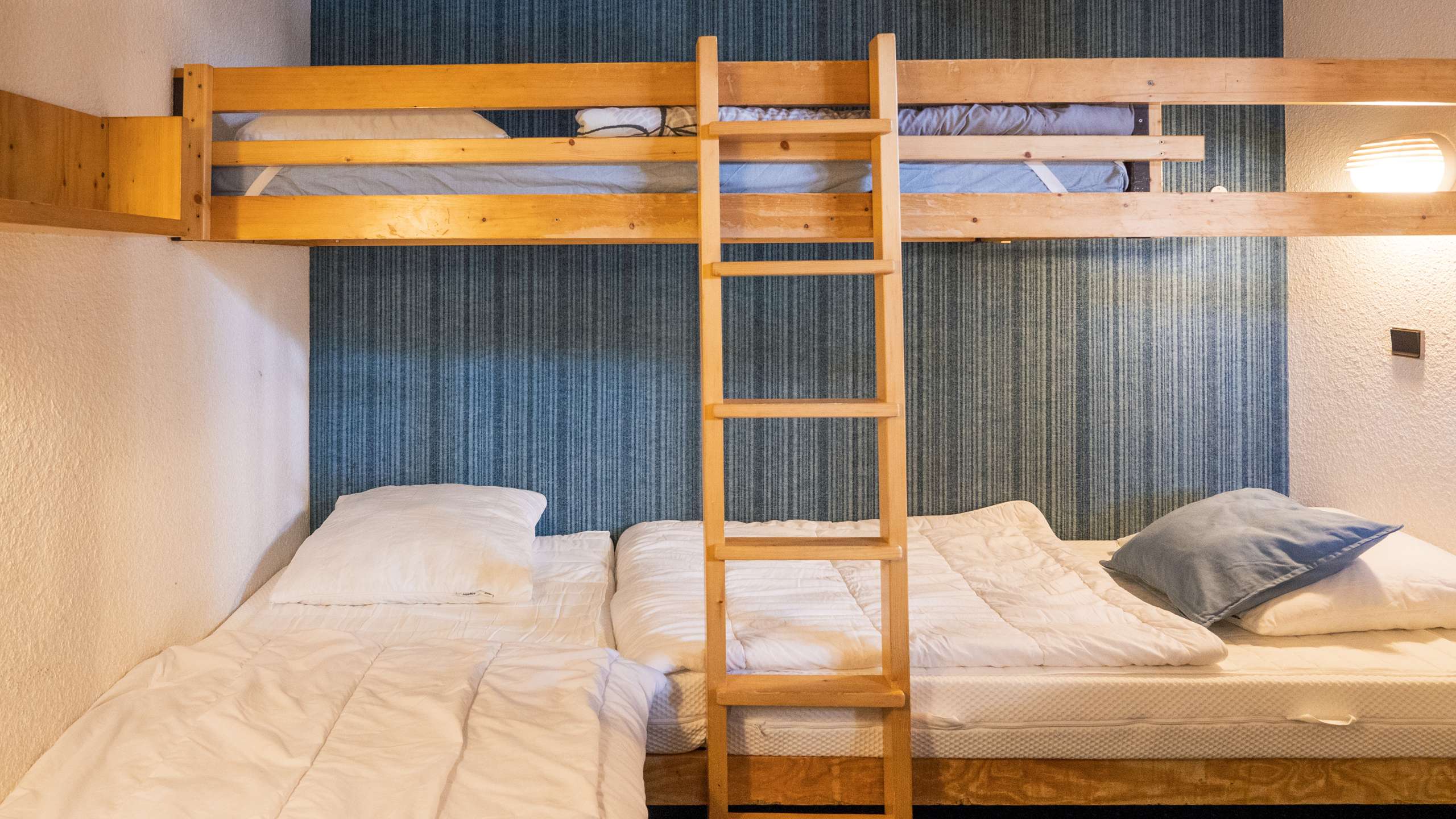 - Description: Bedroom closed by a door with a three single bed, each equipped with 1 pillow and a duvet.