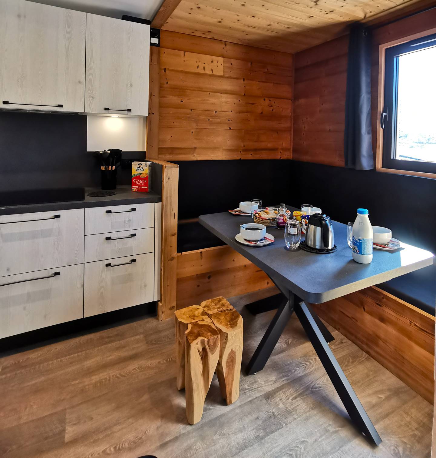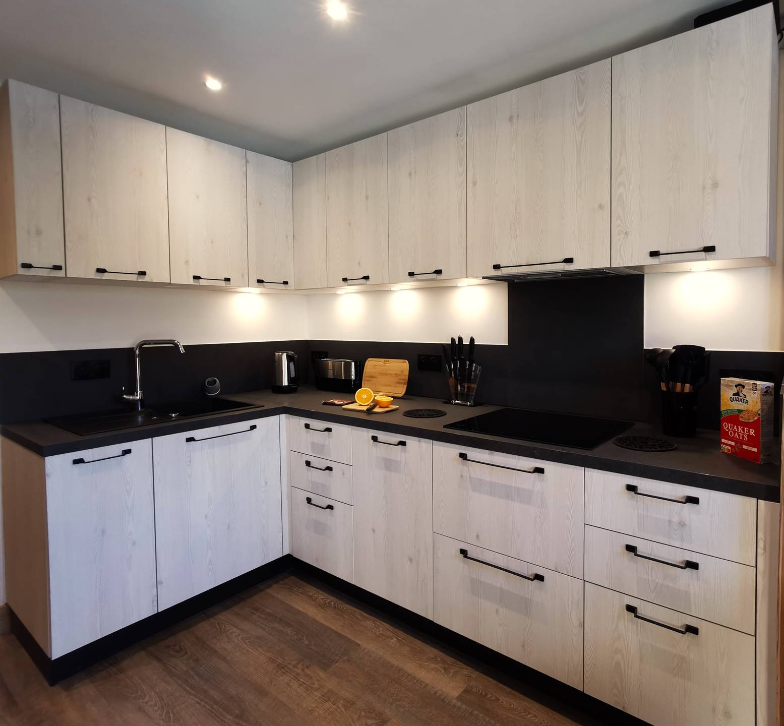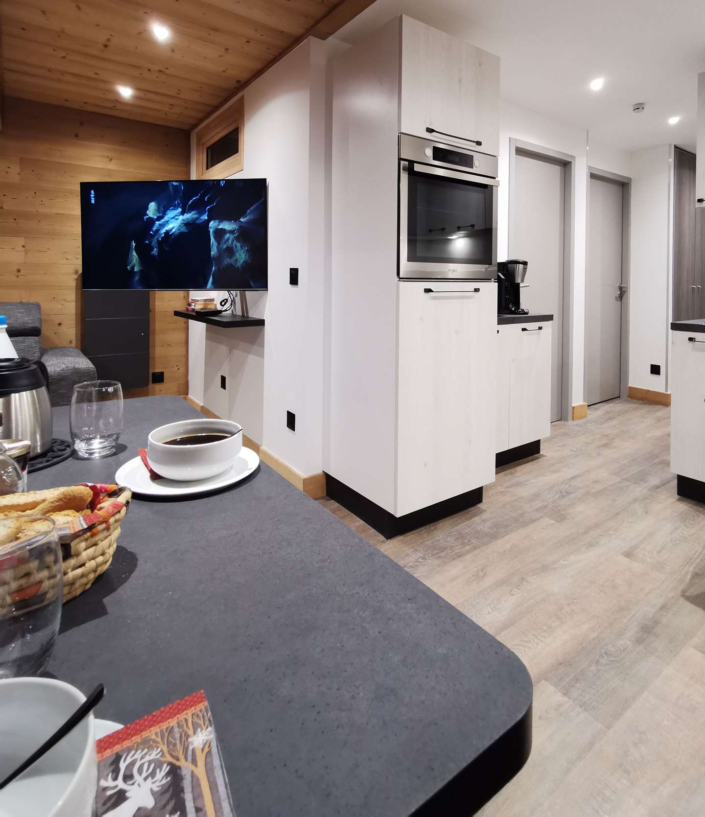 - Description: open to the dining area, it is very well equipped with quality dishes and household appliances: oven, microwave, dishwasher, oven, raclette grill...it has many storage.