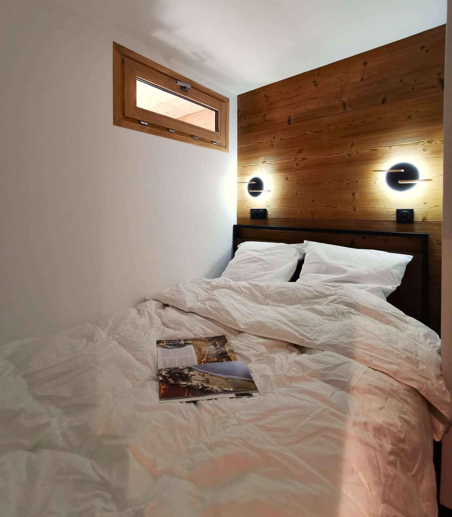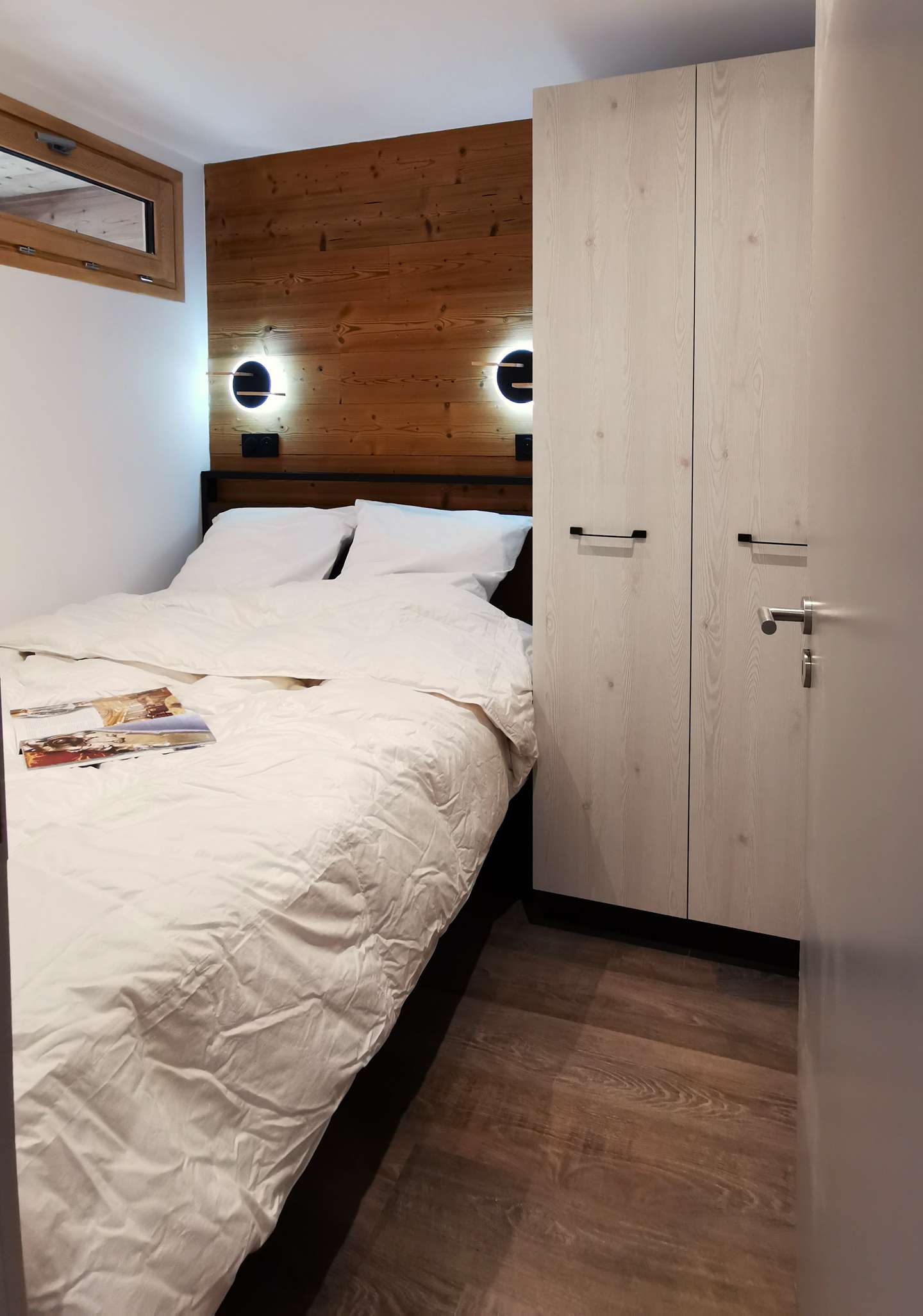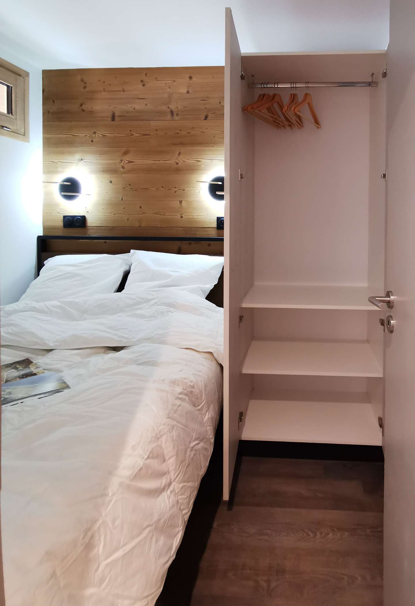 - Description: with 140 cm x 190 cm bed, a large cupboard with wardrobe and reading lights with USB port