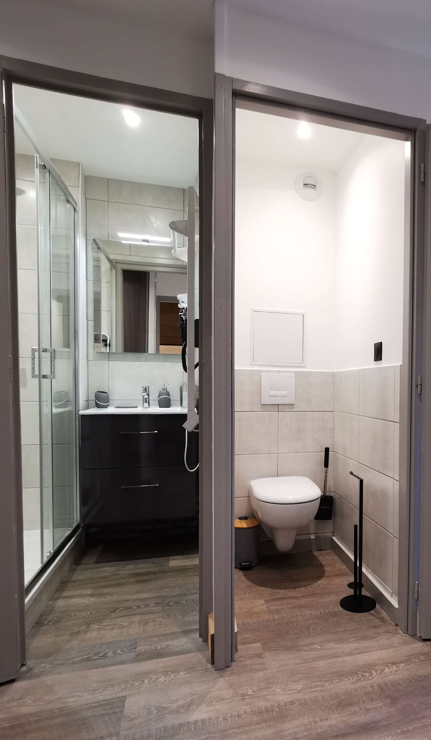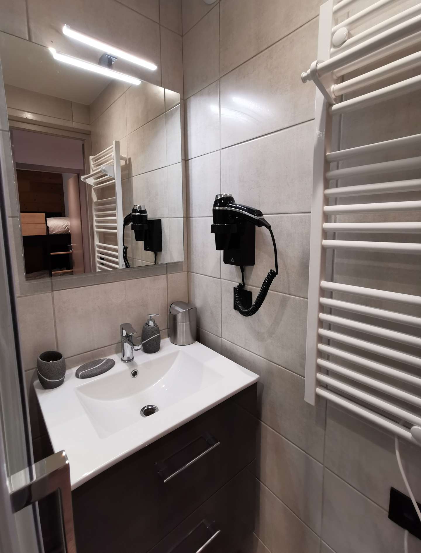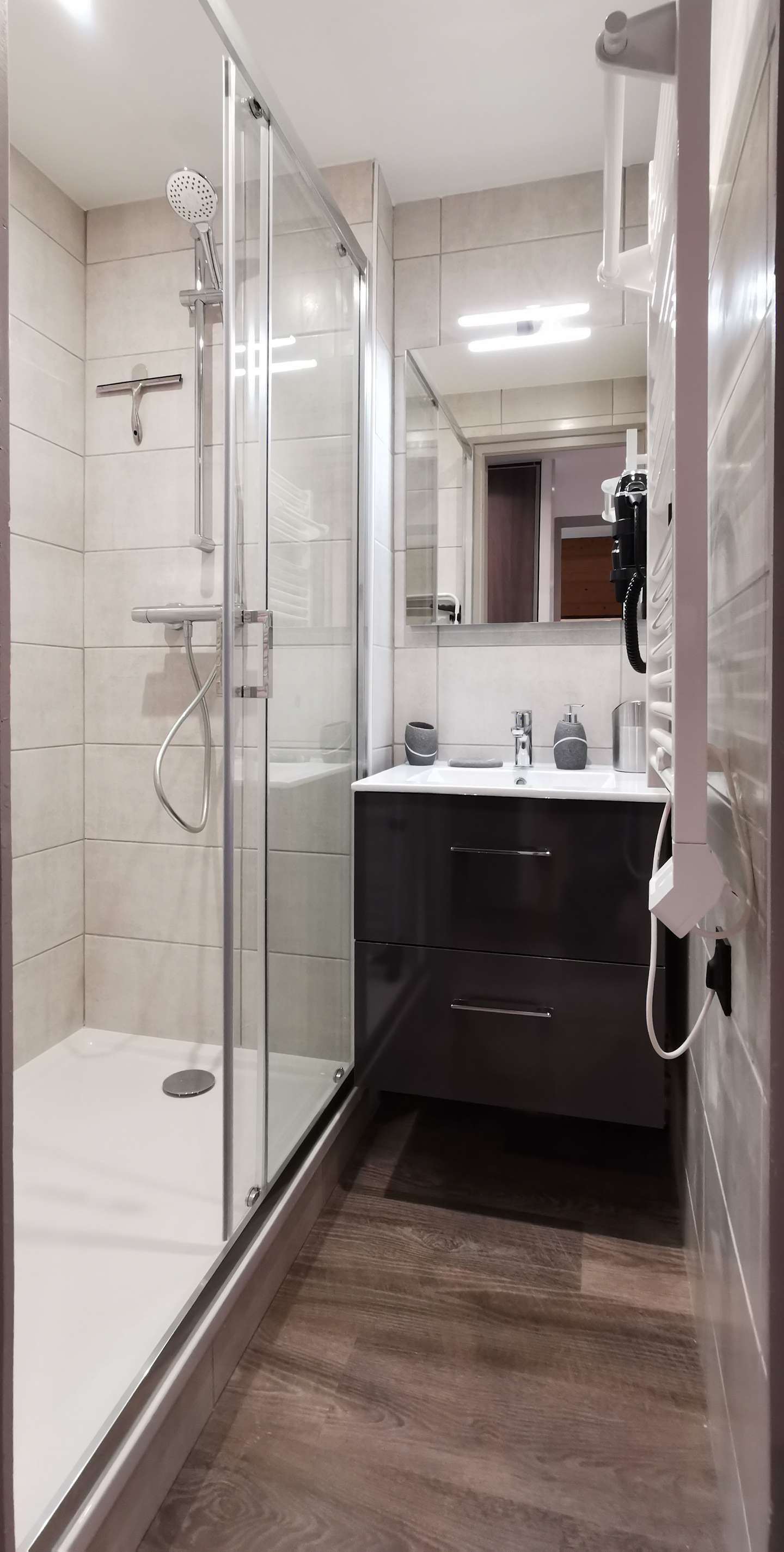 - Description: with shower, vanity sink, hairdryer and radiator dry towel