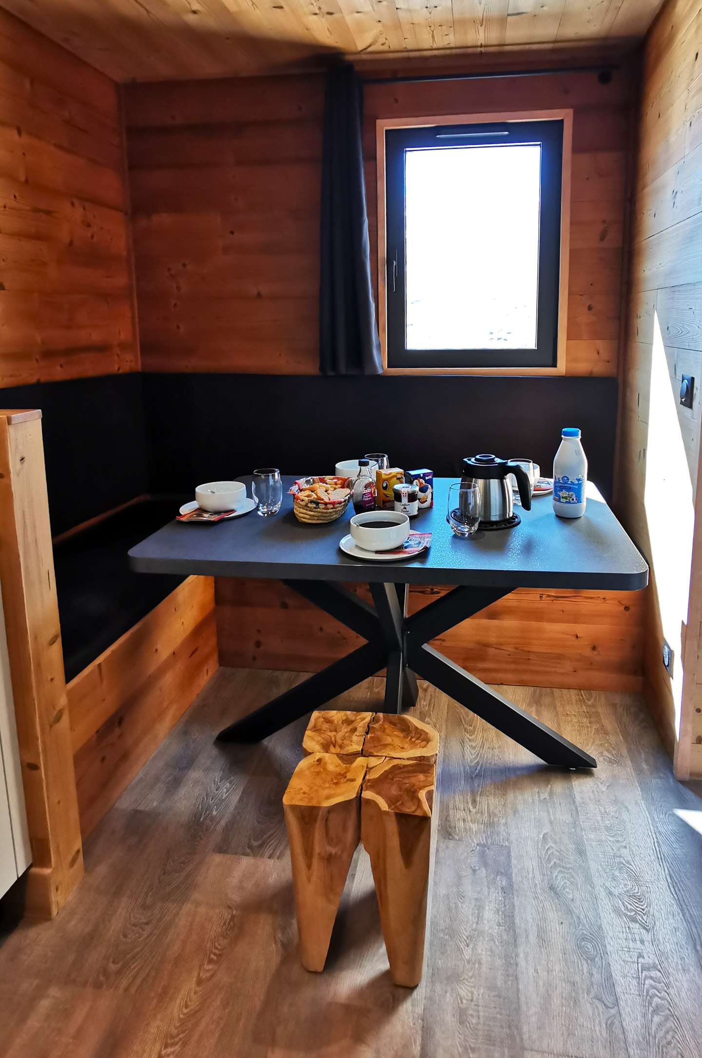 - Description: equipped with a table and benches with integrated storage, it has view of the mountains