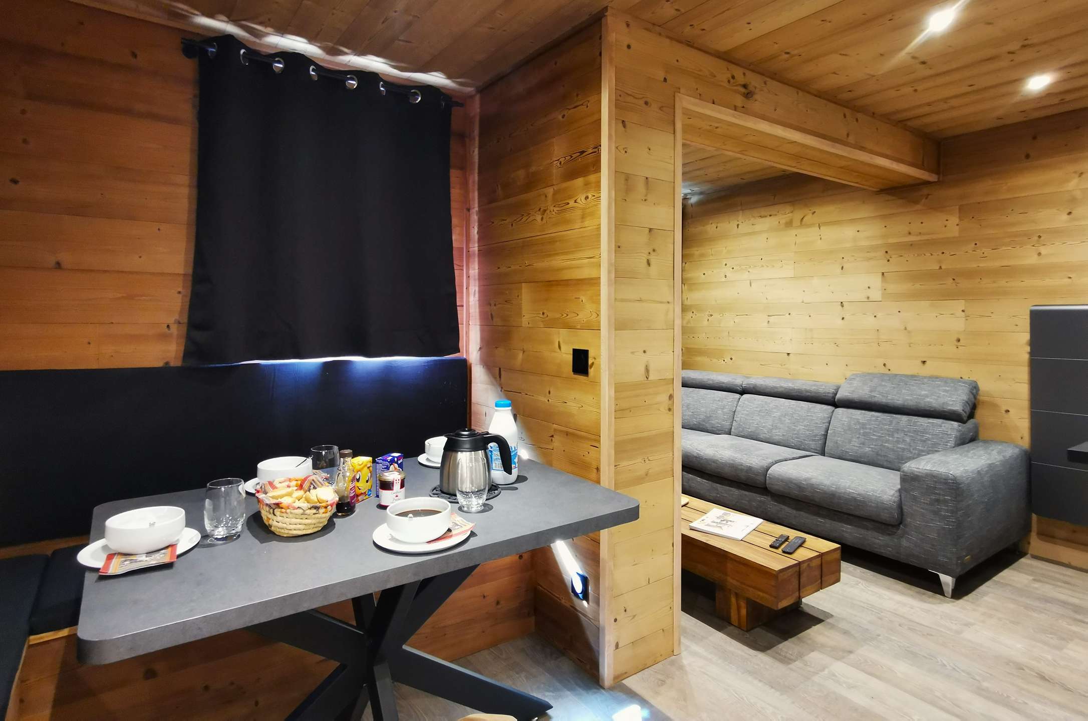 - Description: equipped with a very large leather sofa with headrests, a beautiful table wooden bass and a large smart TV, it has a view of the mountains.