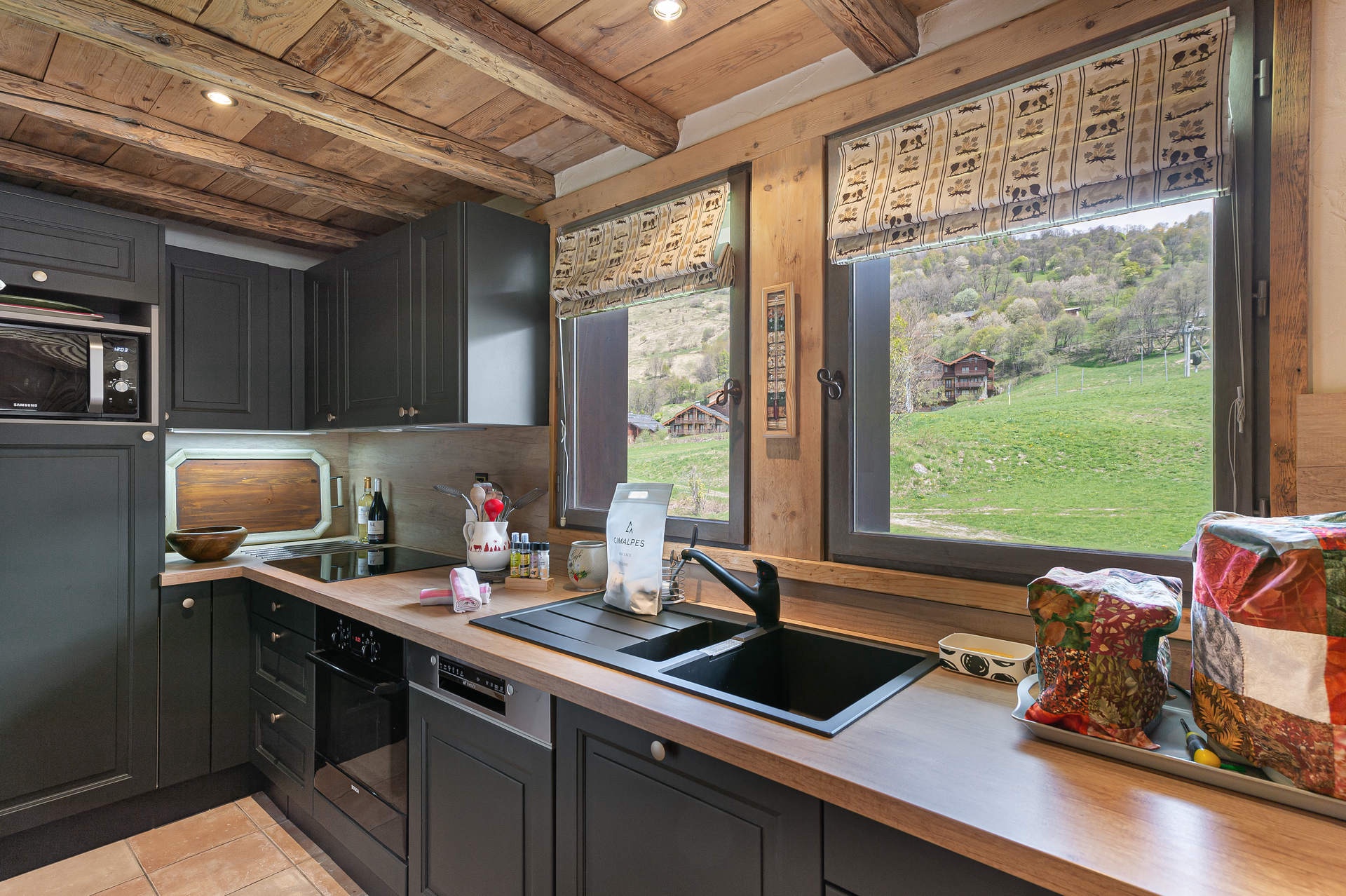 This apartment benefits from an exceptional ski-in / ski-out location in Saint Martin de Belleville. It can accommodate up to 6 adults and 2 children, on the third floor of the residence EPERVIERE.