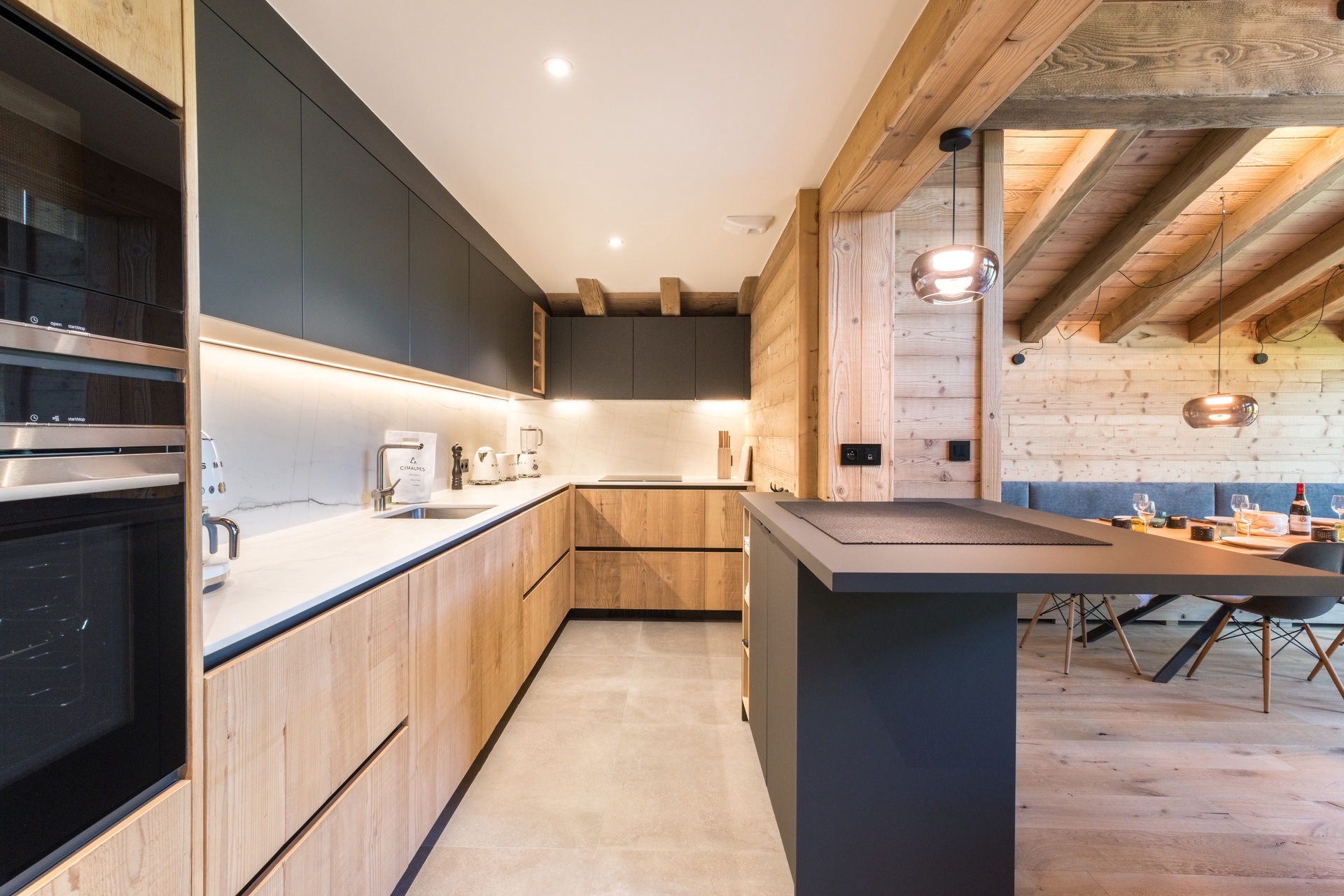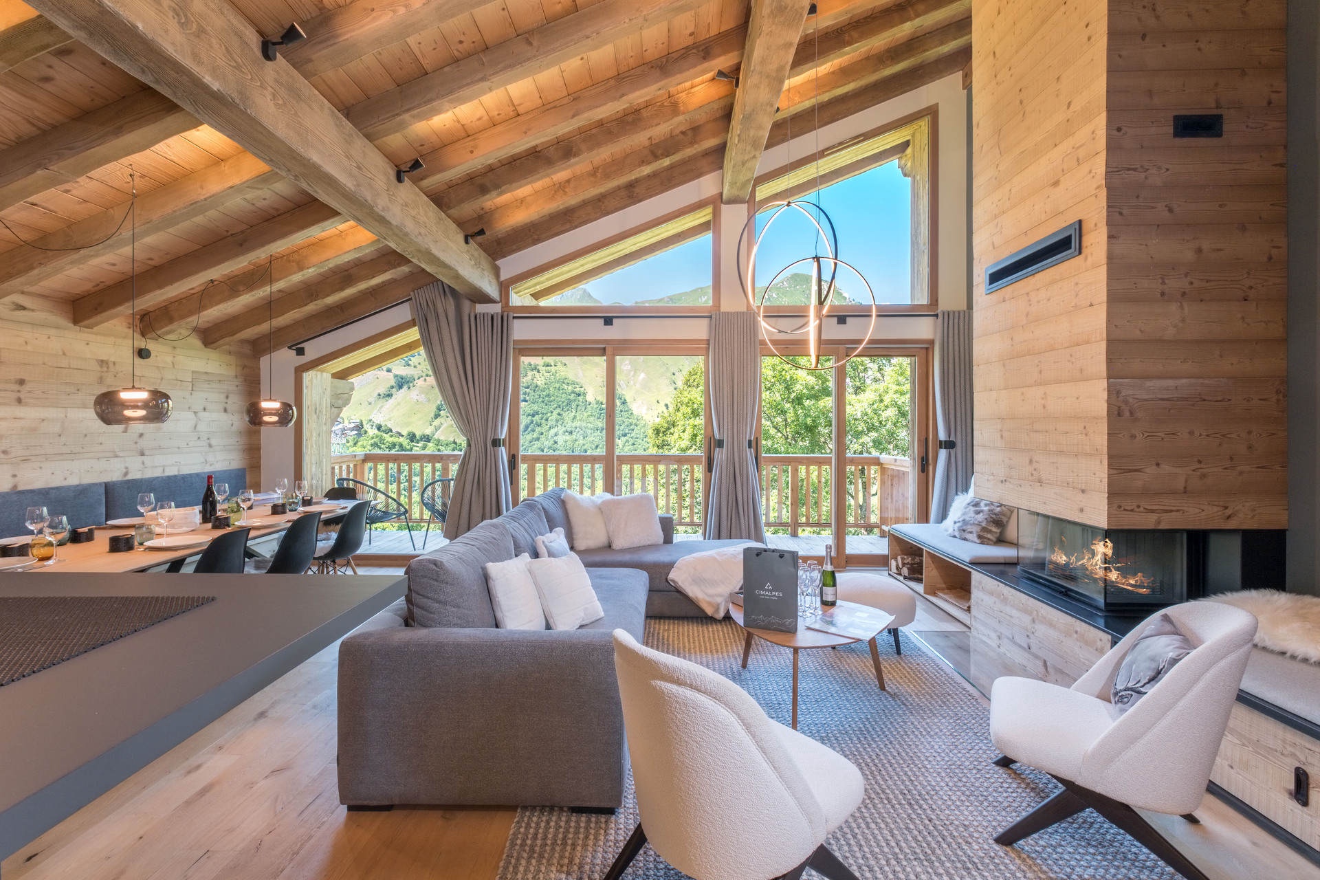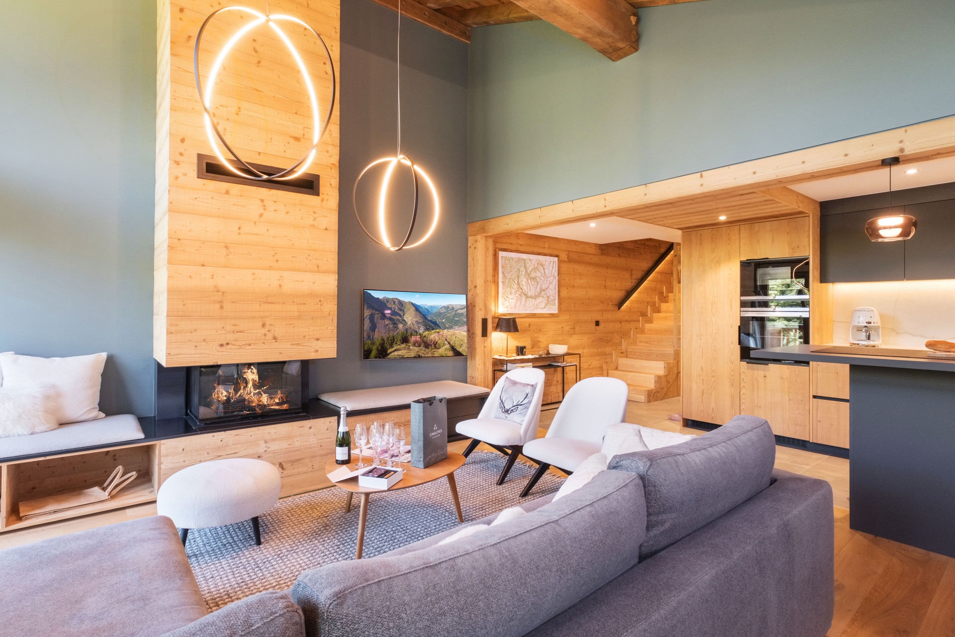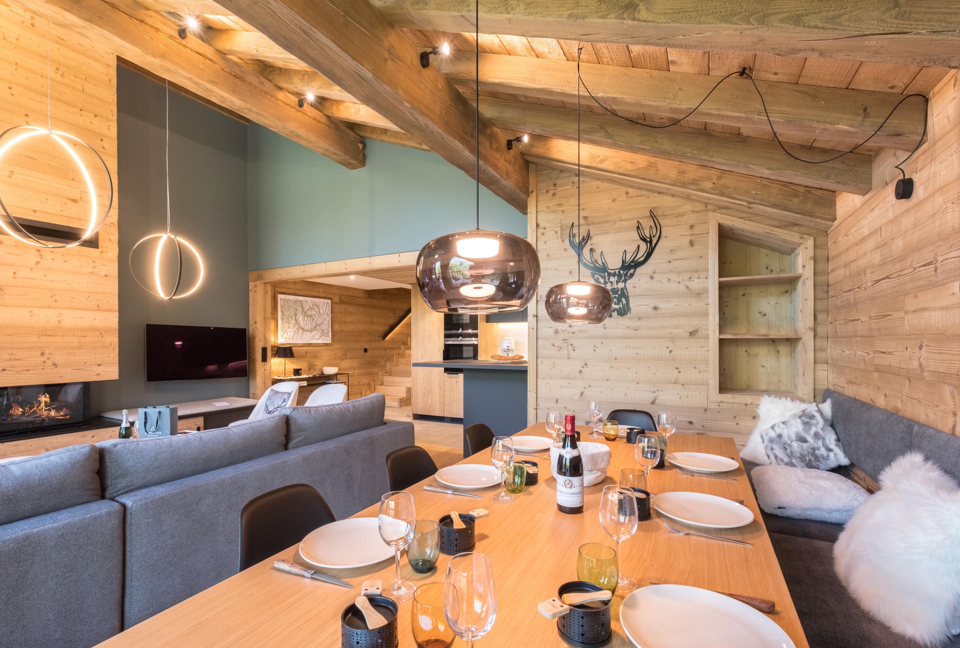 - Living room: lounge, open kitchen and dining room with fireplace in the lounge