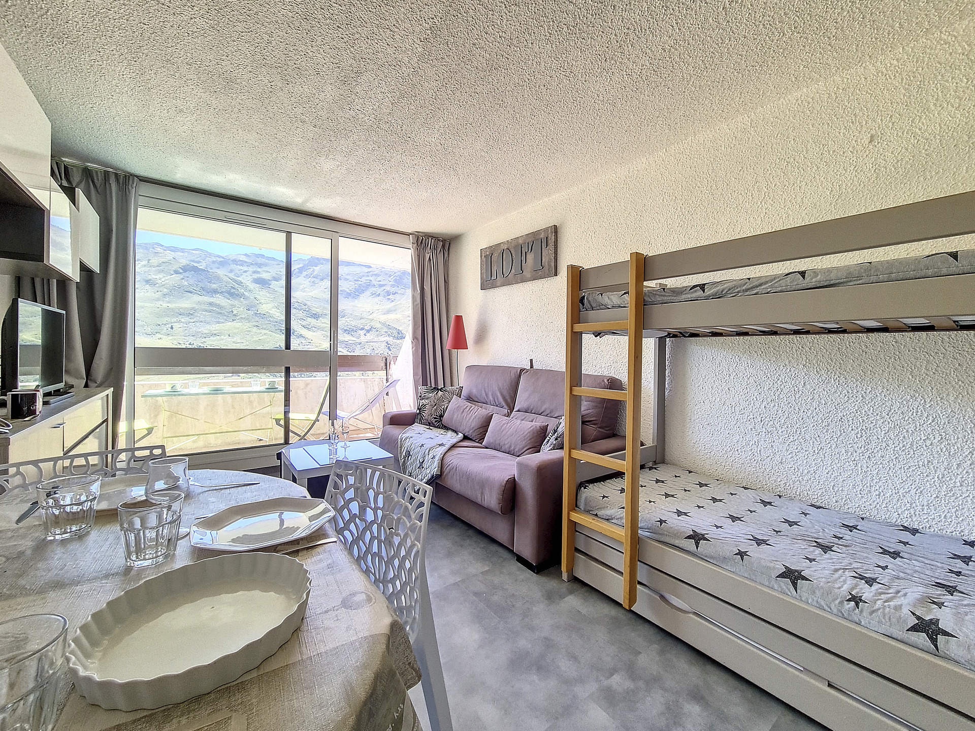 Living room: 1 double sofa bed and two single bunk beds. TV and DVD player.