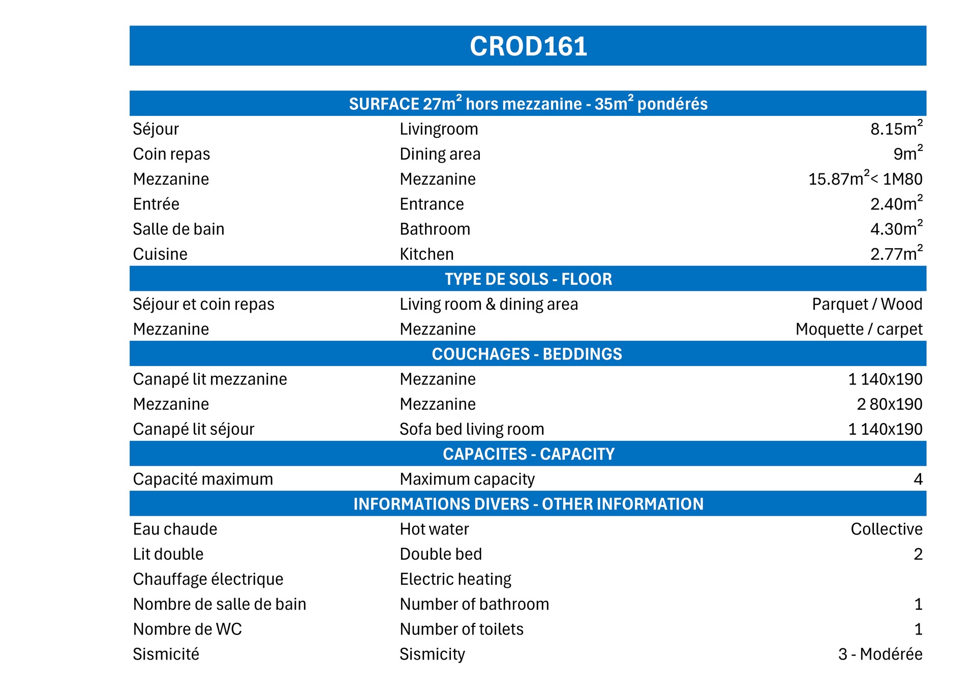 Mezzanine floor (sloping celling, open on dining area): 2 single bed (80x190) or a sofa bed for 2 perons (140x190)