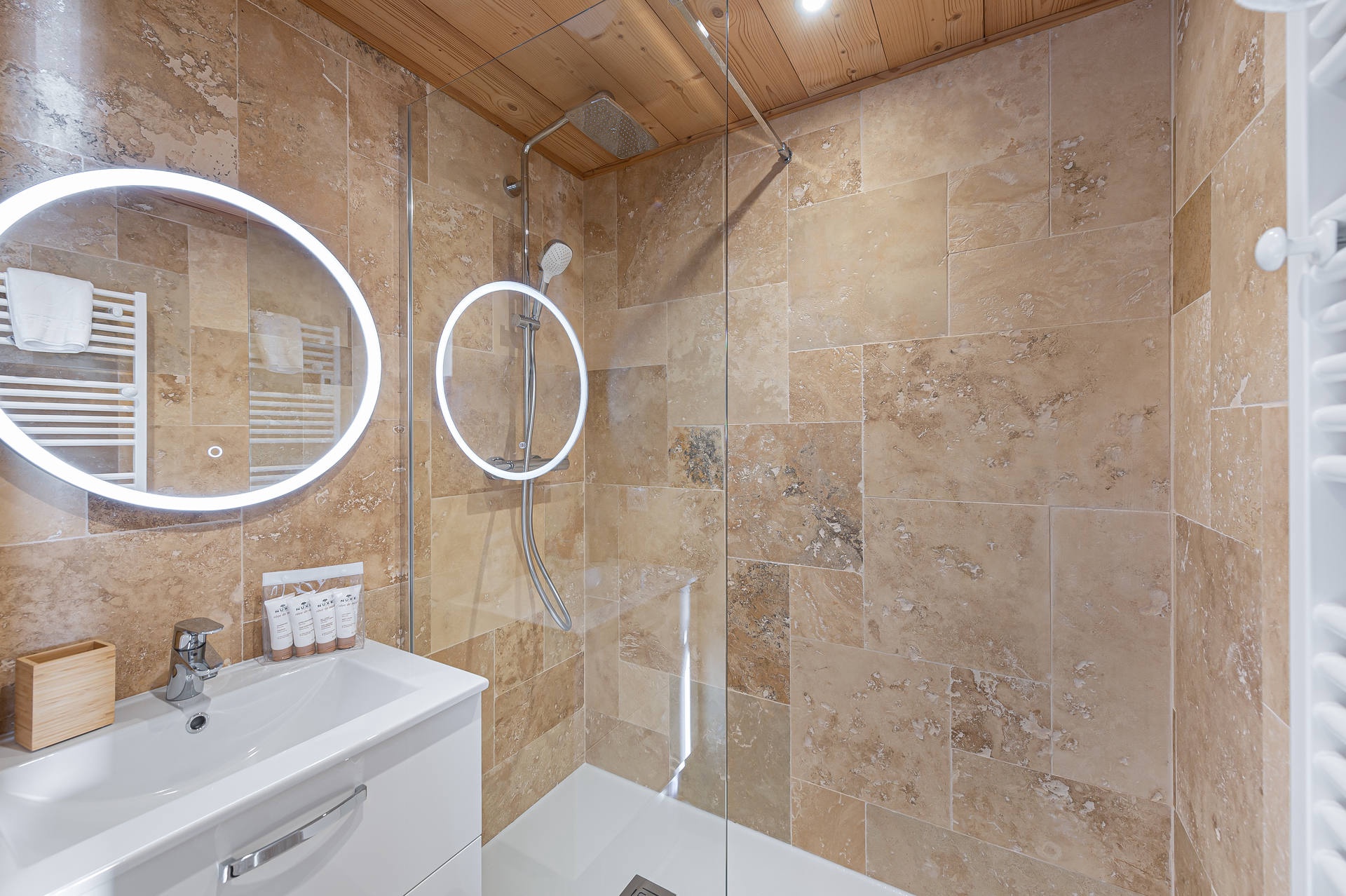 The elegant stone bathroom has a walk-in shower for relaxing after a busy day on the slopes. Finally, the furnished balcony offers a breathtaking view of the slopes and the somme de la Masse, allowing you to make the most of the sunsets our mountains have to offer.
