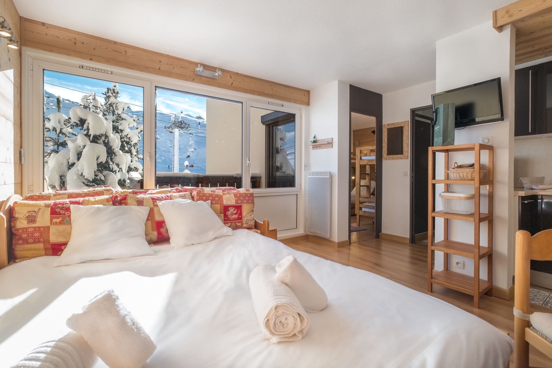 Apartment of 33 sqm for 5 persons with a superb panoramic view on the mountains, facing south. It is located in the residence Olympic, in a quiet and very appreciated area of Val Thorens. The residence is ski In/Out.
