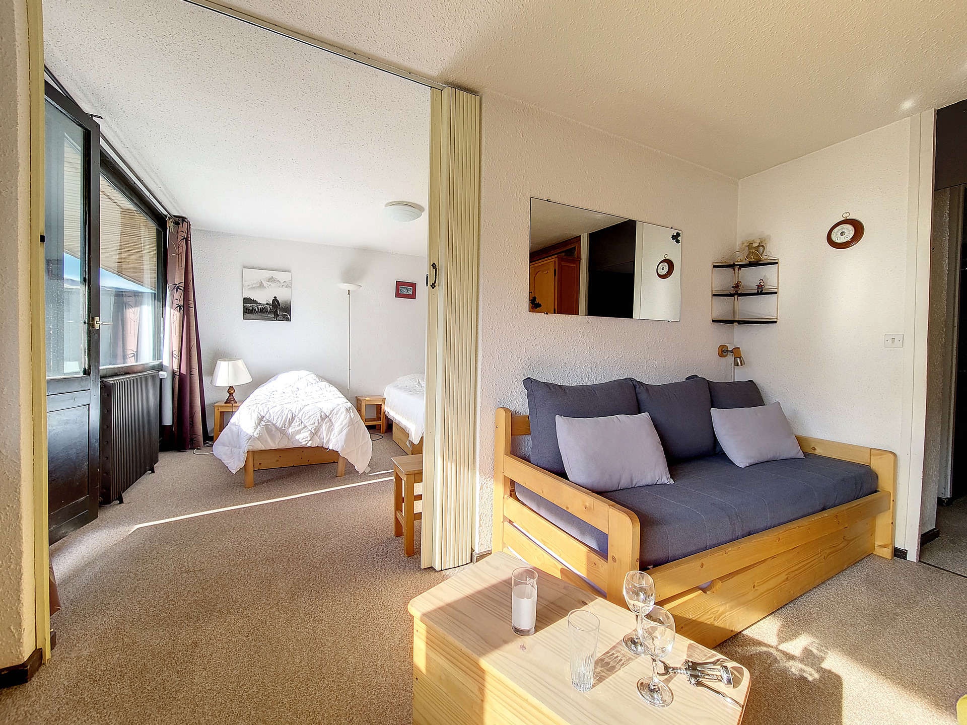 Apartment of 2 rooms with sliding wall of 42 m², for 6 people,with South/West-facing balcony,on the 7th floor with lift.