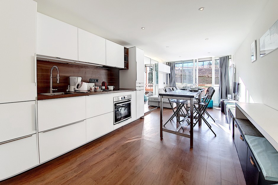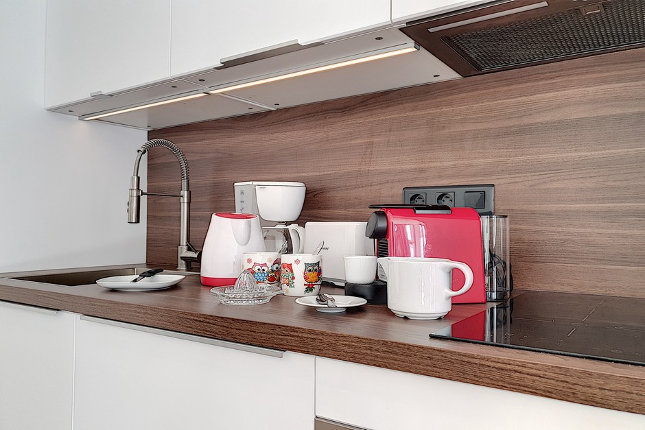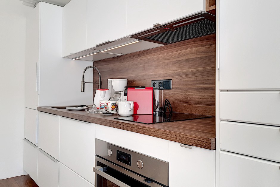 Separate kitchen with induction hob, fridge, oven, microwave, dishwasher, kettle, toaster and coffee maker.