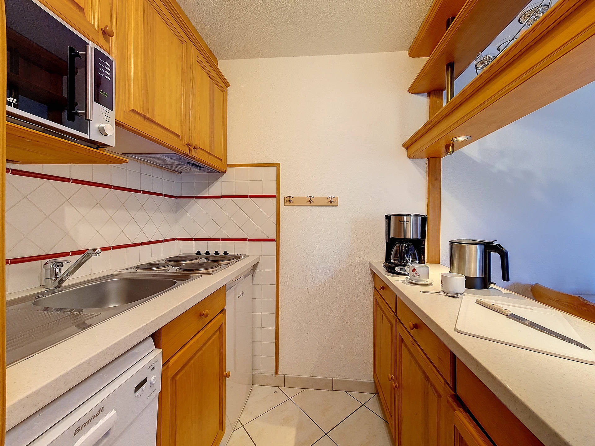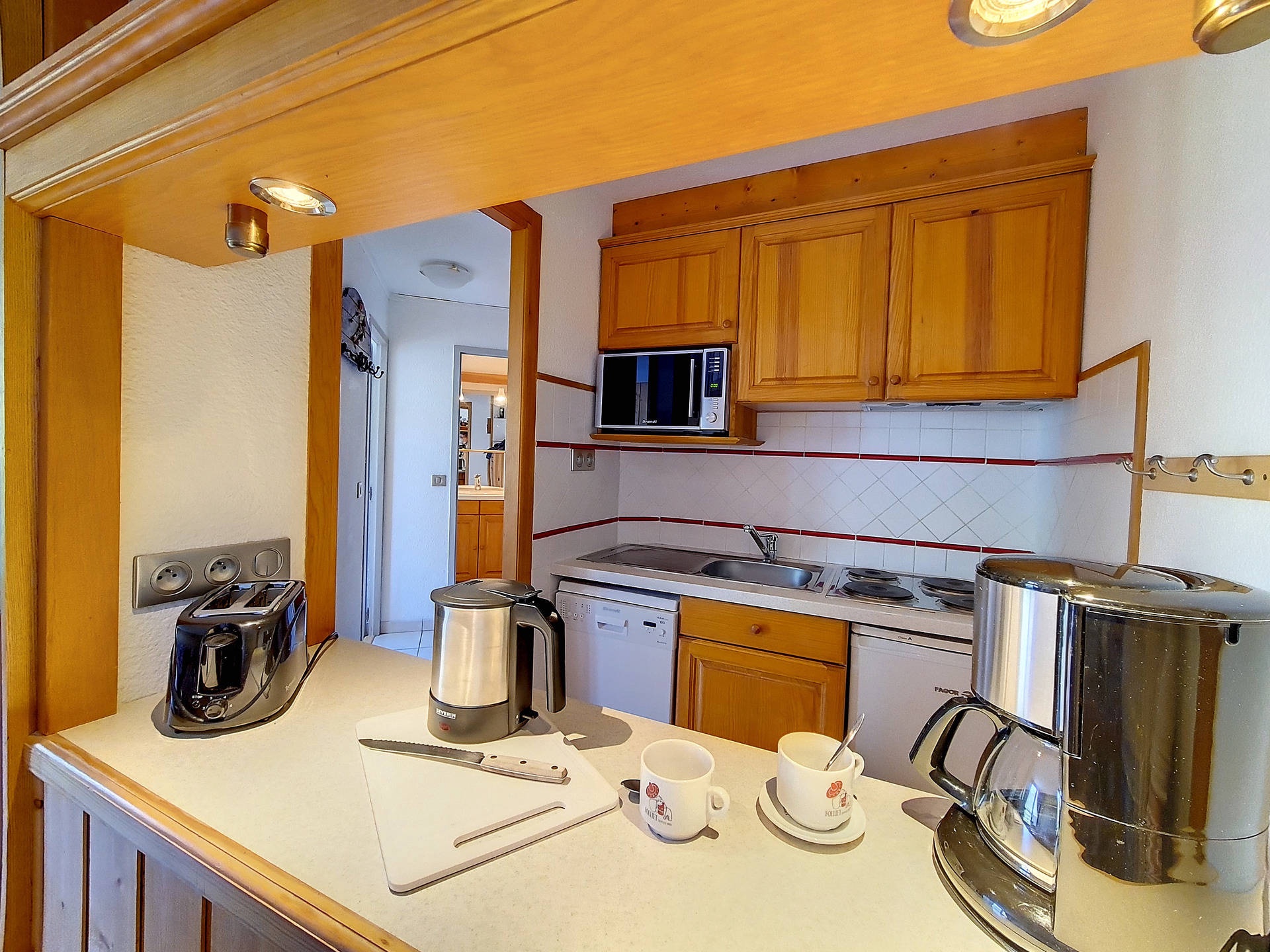 Separated kitchen with 4 hotplates, micro-wave oven grill, fridge, dishwasher, kettle, coffee maker and toaster.