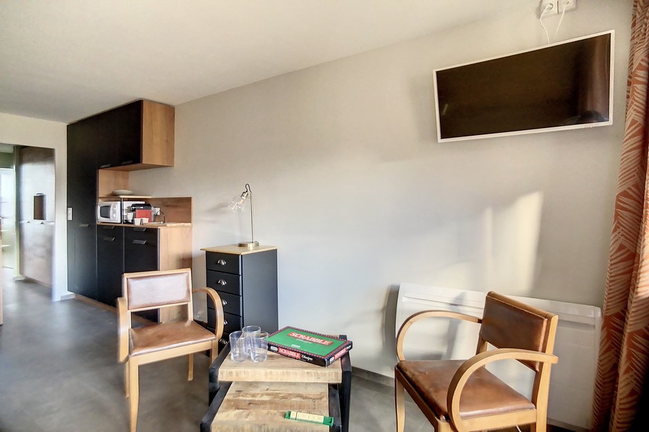 Living room: Lounge with dining room table, sofa bed for 2 pers, and TV