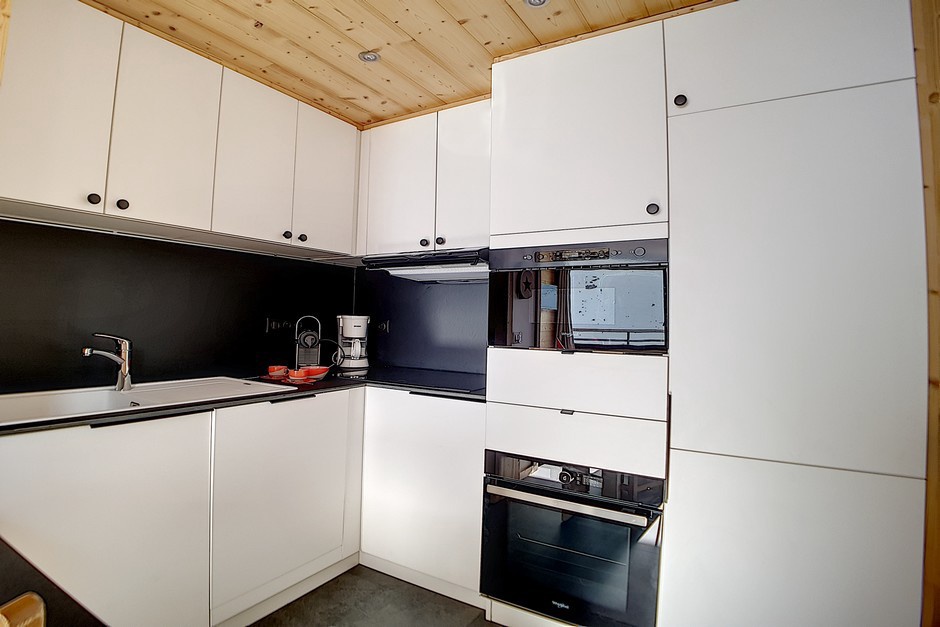 Kitchen with hotplates, oven, microwave oven, dishwasher, kettle, toaster, classic coffee maker and Nespresso.