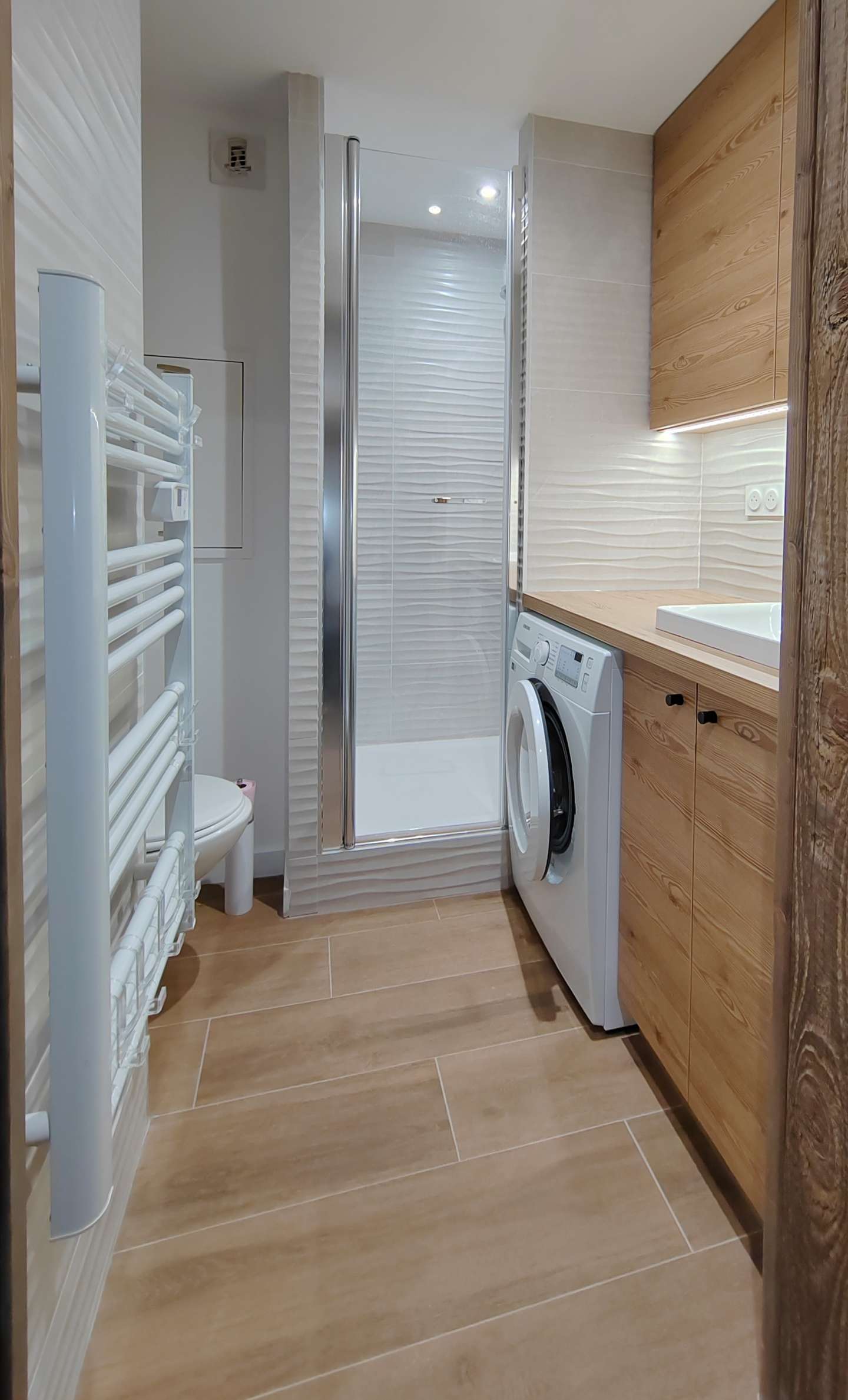 - Description: with shower, hand shower, washbasin on cabinet and heated towel rail.