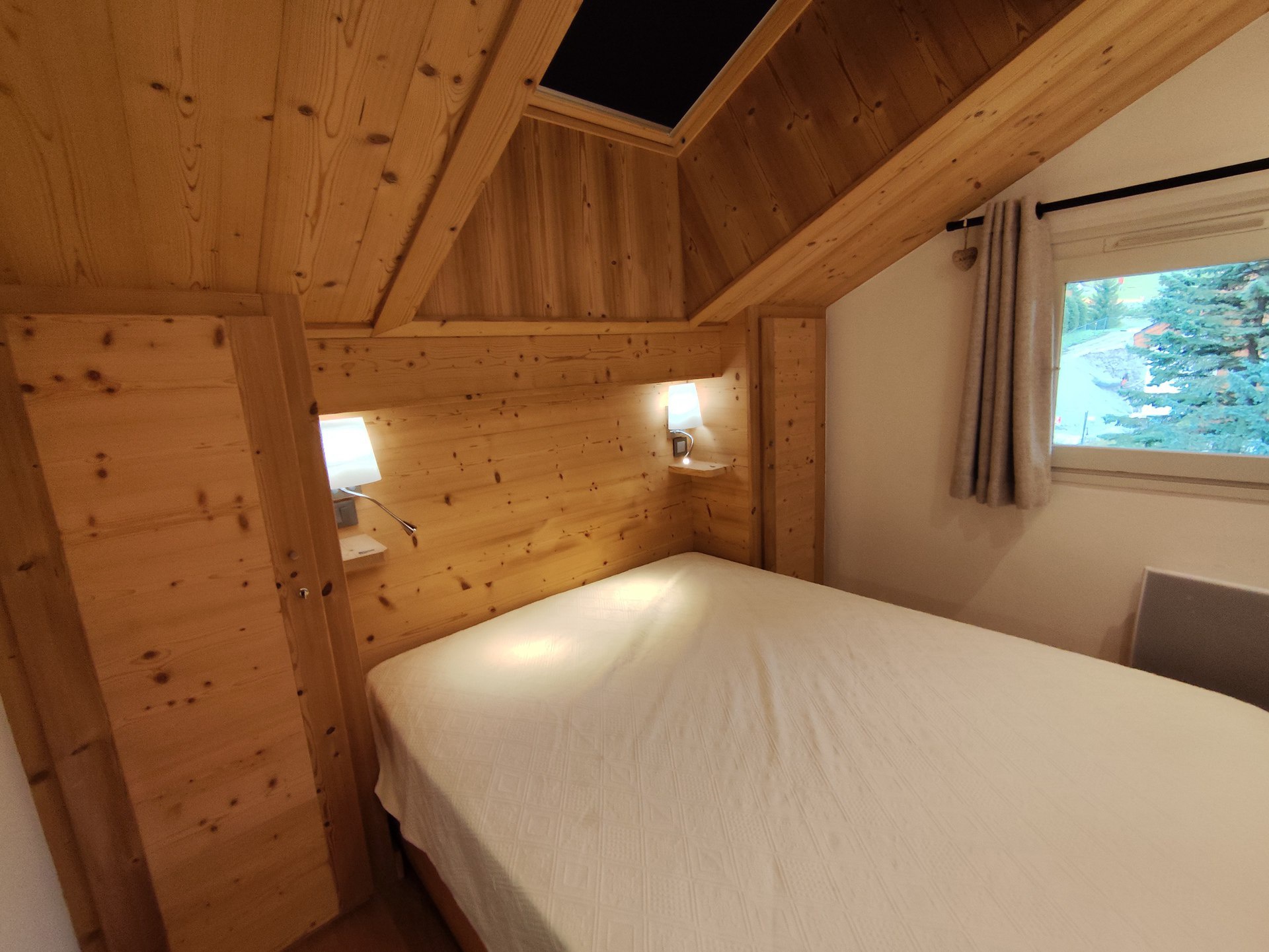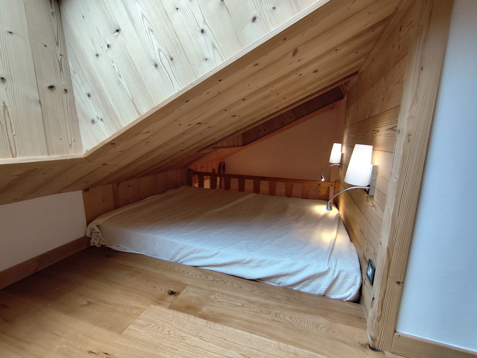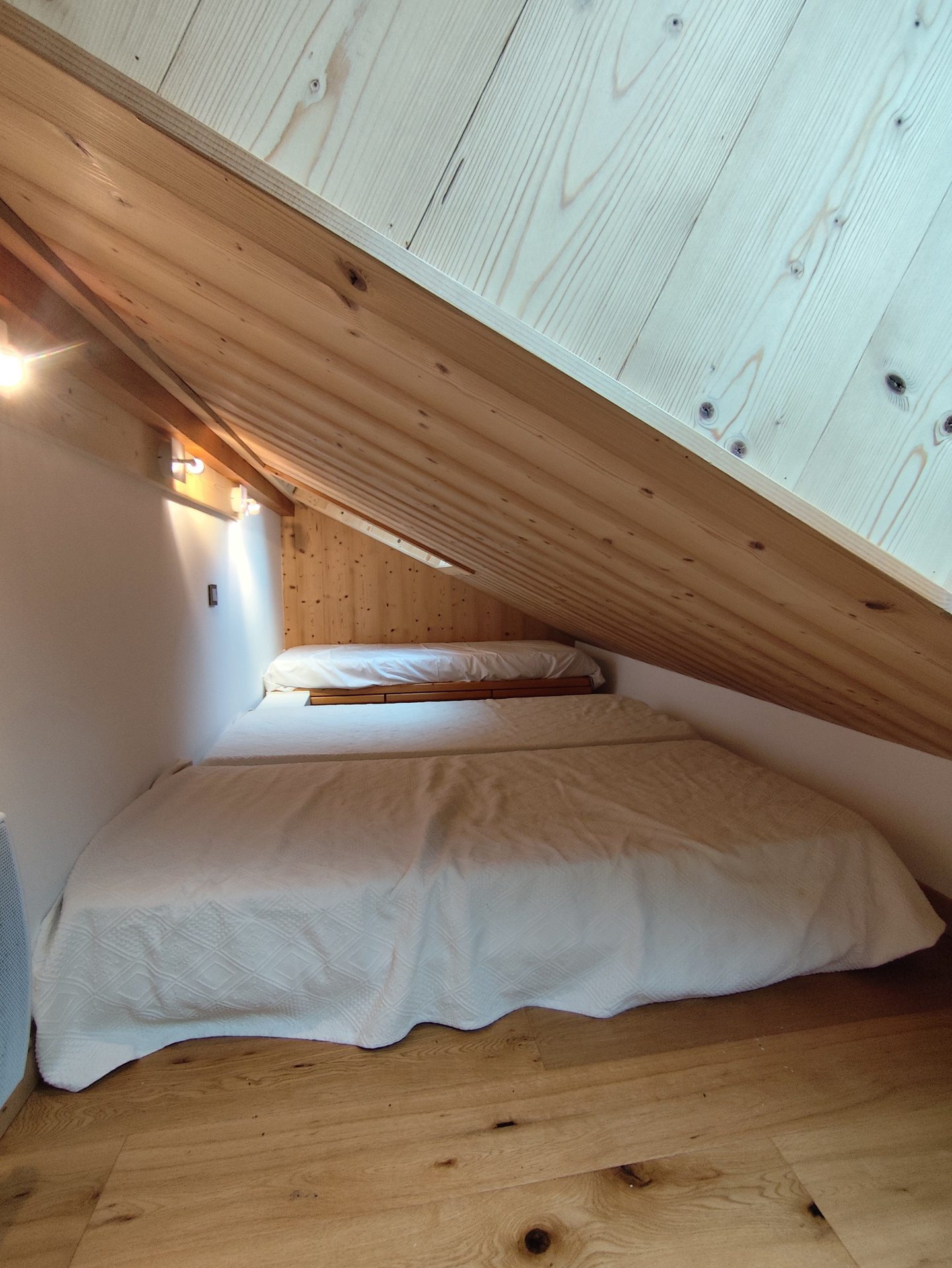 On the mezzanine under the roofs 3 single beds and a double bed. The double bed is exclusively reserved for children over 12 years old.