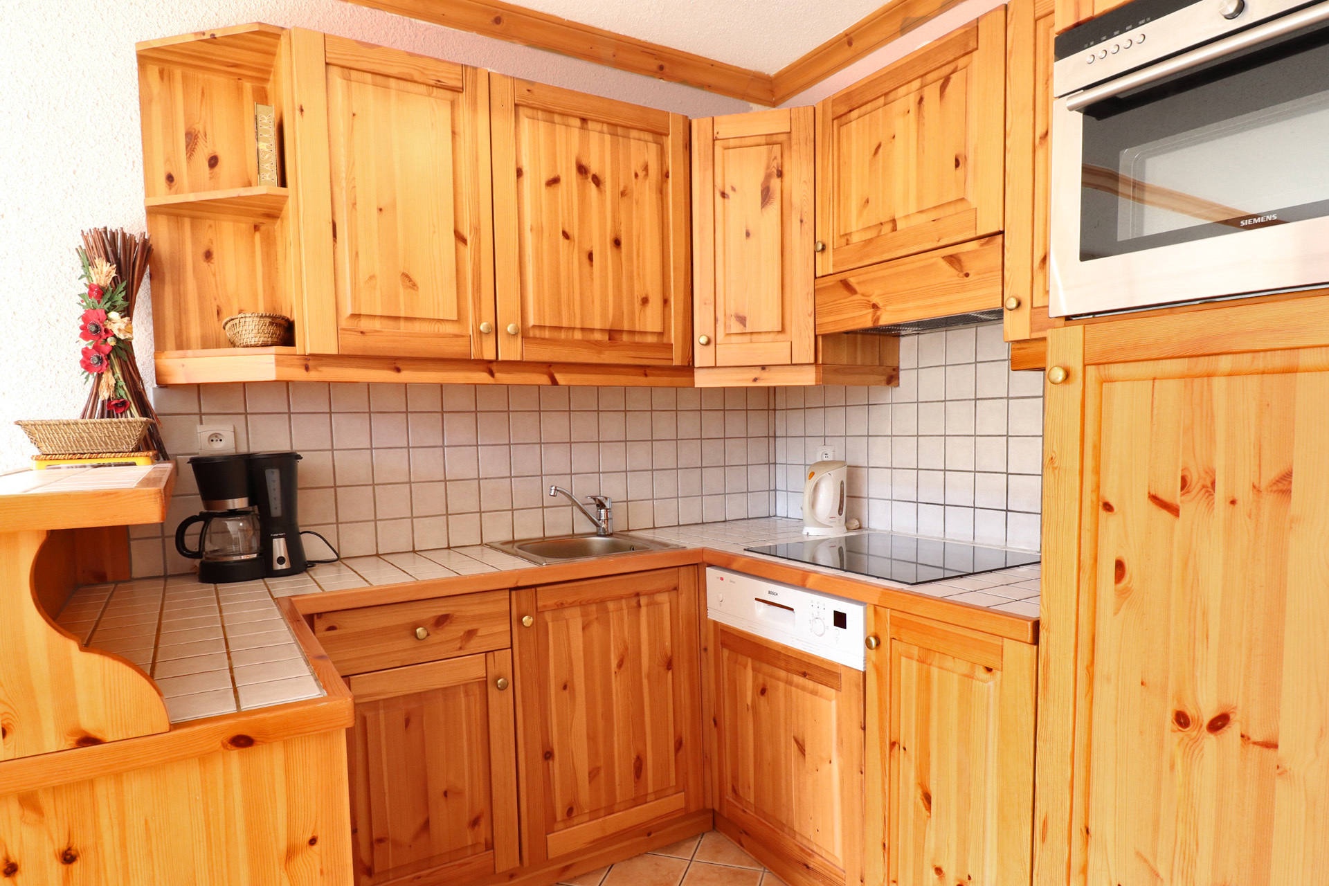 Kitchen corner: oven, fridge, dishwasher, 4 ceramic hobs, hoo, filter coffee machine, toaster, electric kettle