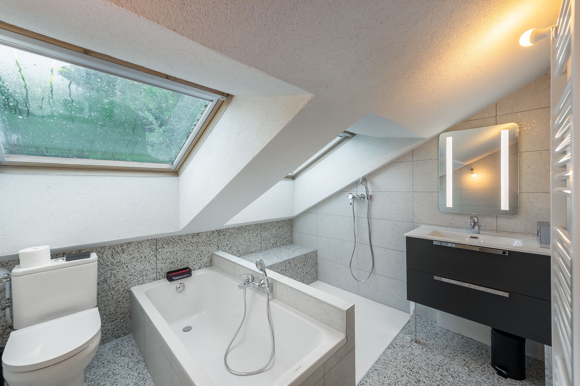 - Bathroom with shower, bath and toilet
