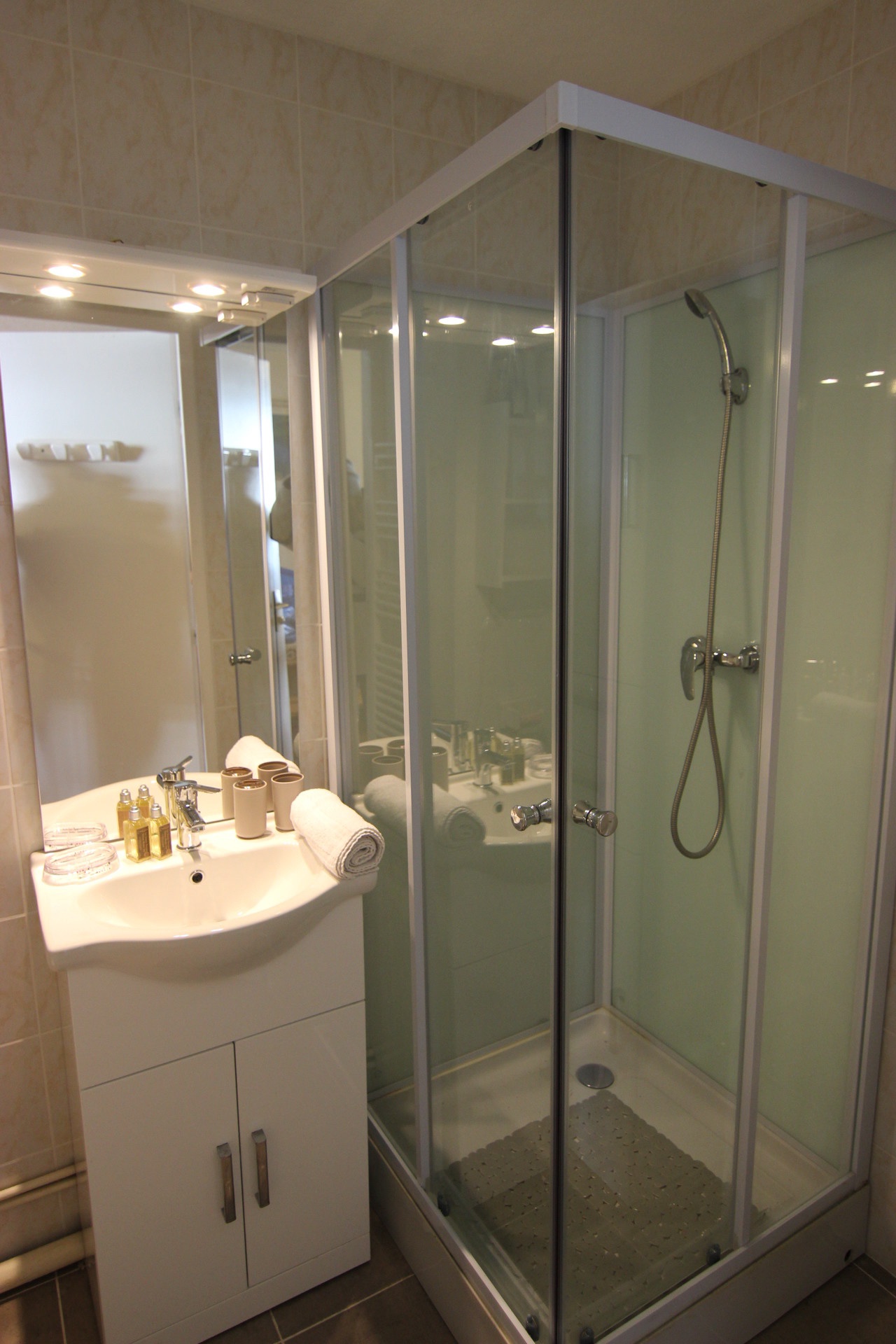 Bathroom: shower, sink, toilet