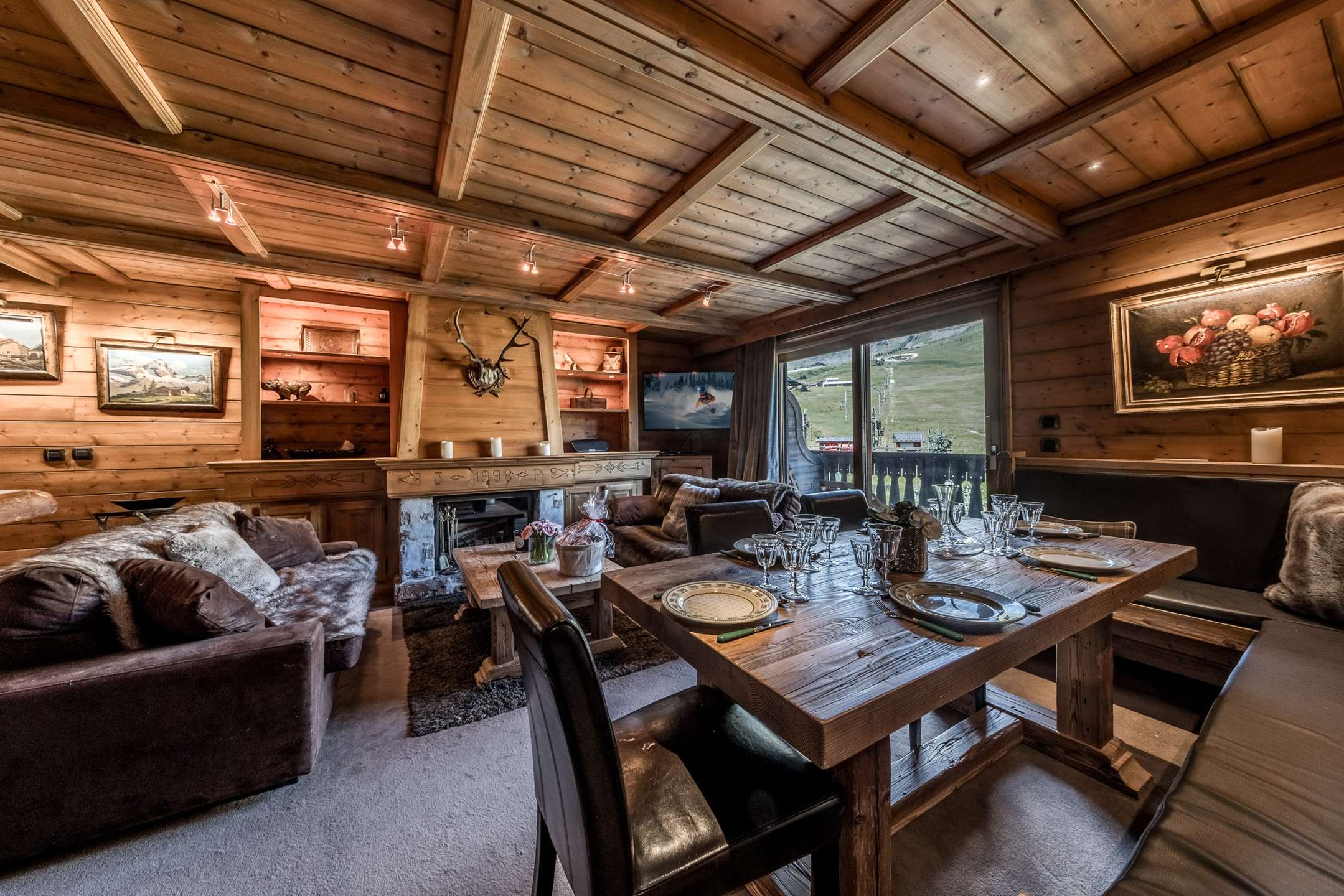 - A living/dining room with television, fireplace and terrace access