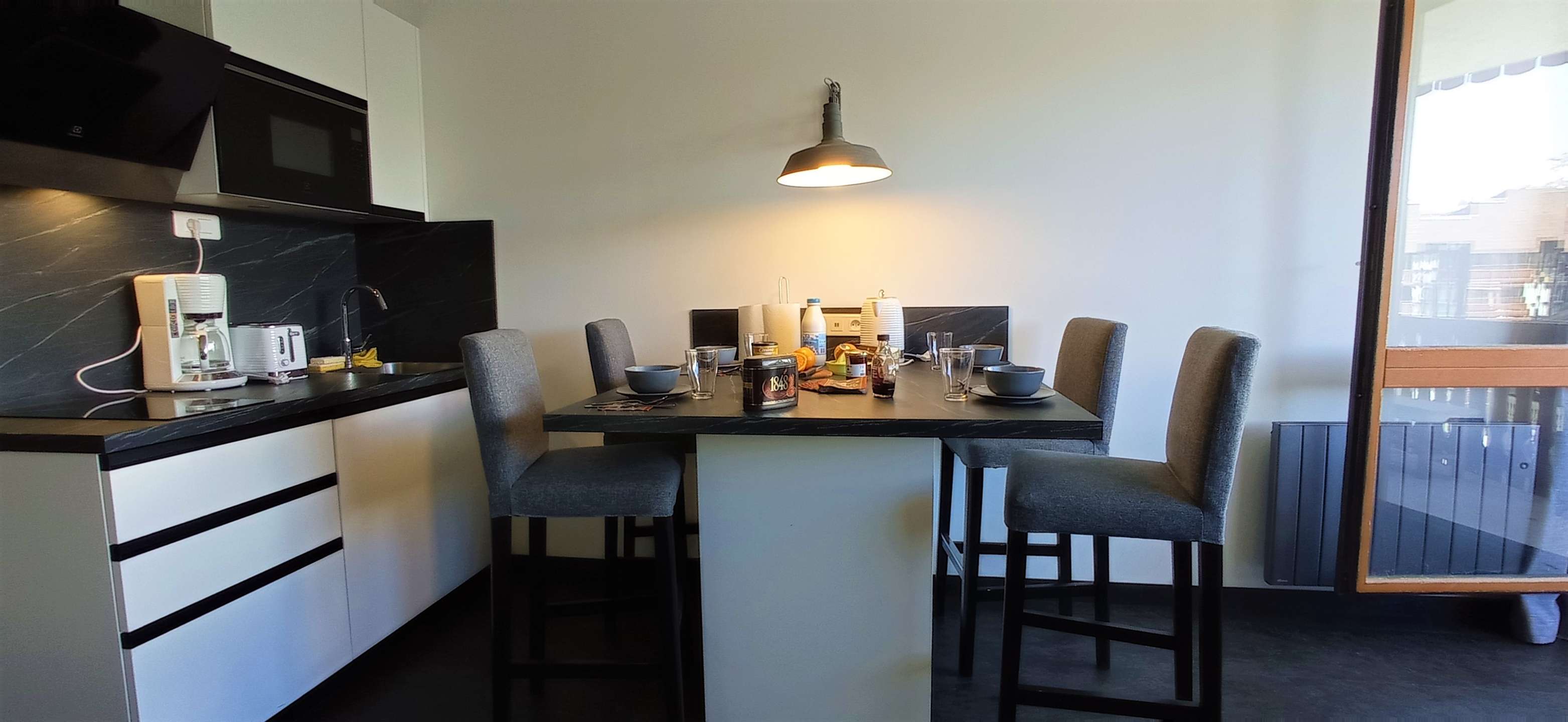 - a kitchen open to the living room, equipped with an oven, a microwave, an island for eating with high chairs and storage underneath, a refrigerator, a dishwasher so that they are real holidays, a two-burner induction hob and plenty of storage space, - a beautiful balcony with table and benches as well as two deck chairs, ideal for sunbathing, smoking or admiring the view.
