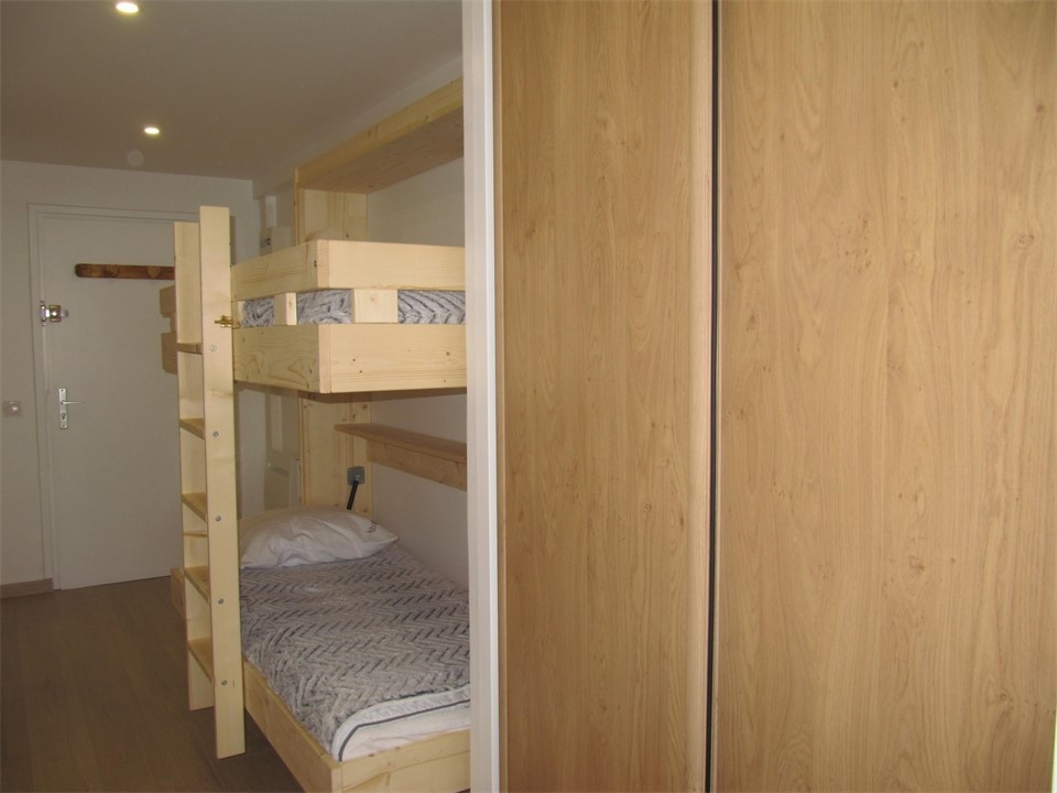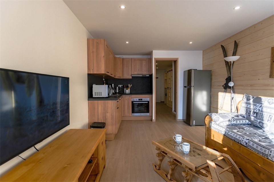 Apartment all renovated in 2019, mountain (wood) style for 6 persons. This apartment is 34 m² + a veranda of 7 m², located on the 4th floor with a lift. South view on the Cimes de Val Thorens.