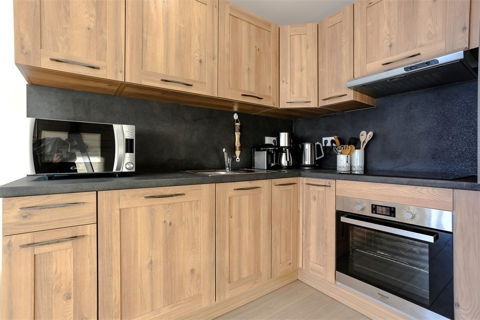 - Open kitchen entirely equipped for 6 persons, with induction hobs, dishwasher, oven, microwave, fridge, Nespresso, coffee machine, toaster and electric kettle.