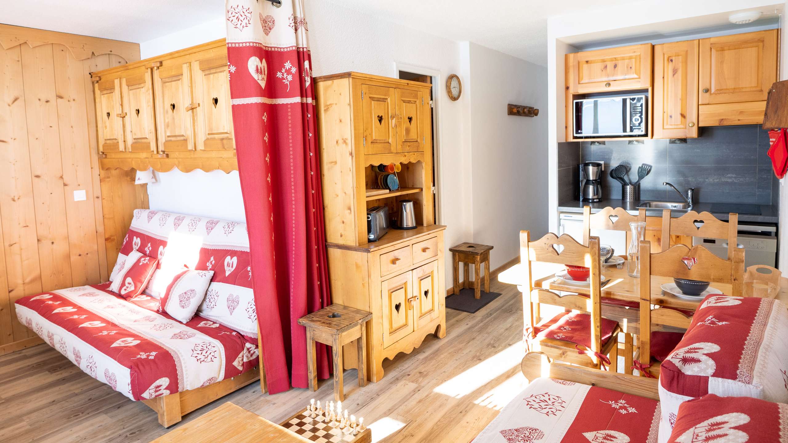 - Fully equipped kitchenette for 4 people with induction hob, dishwasher, microwave, fridge, filter coffee machine, toaster and kettle.