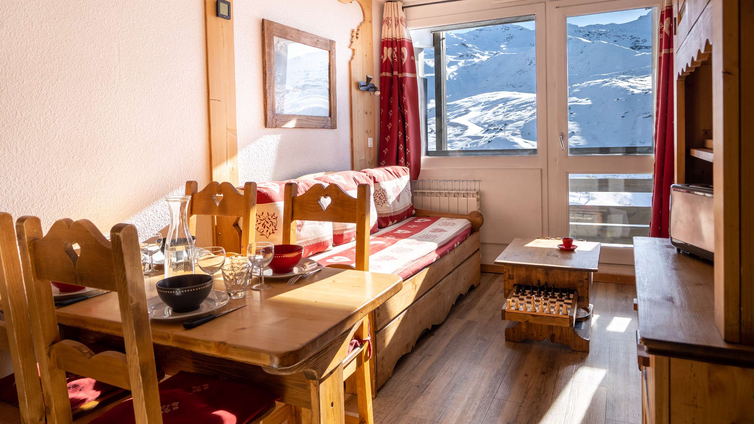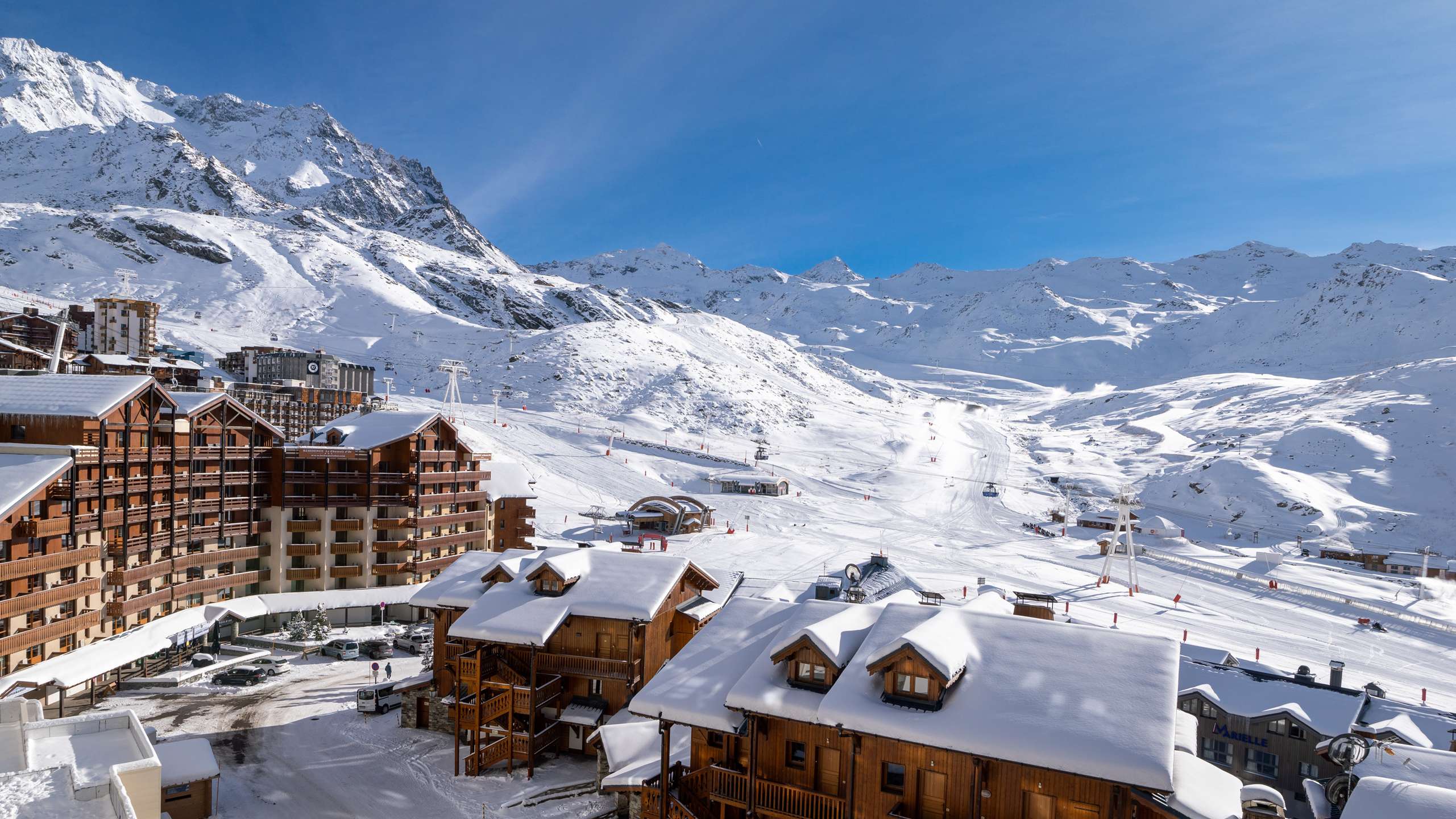 Located in the Les Lauzières residence with caretaker. Quiet area in the lower center of Val Thorens close to shops and restaurants and ski-in ski-out from the back of the building.