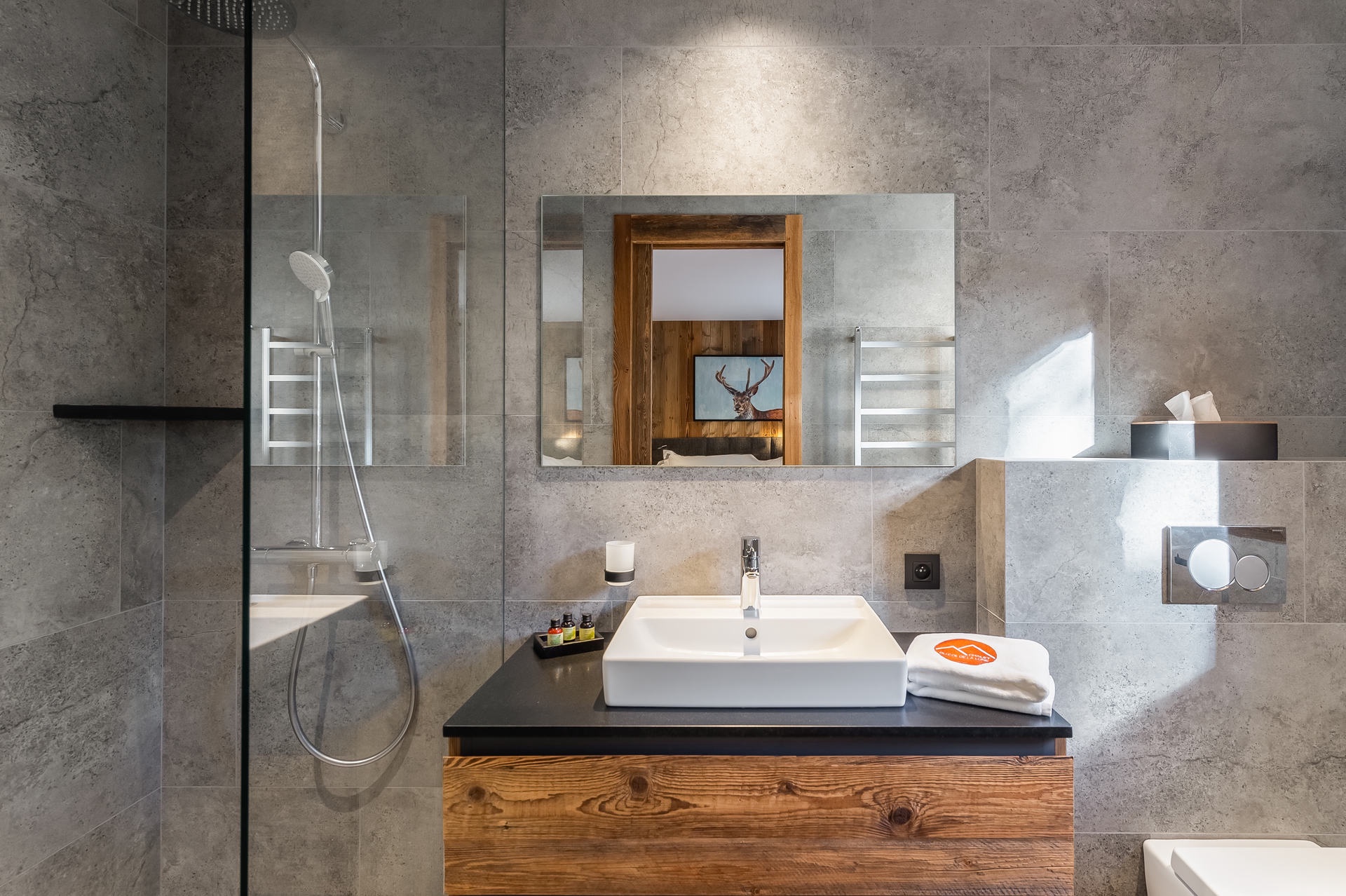 Bedroom 2: 1 double bed (140x200cm), 1 bunk bed (2x 90x200cm), ensuite bathroom (washbasin, shower, towel dryer, hair-dryer), television