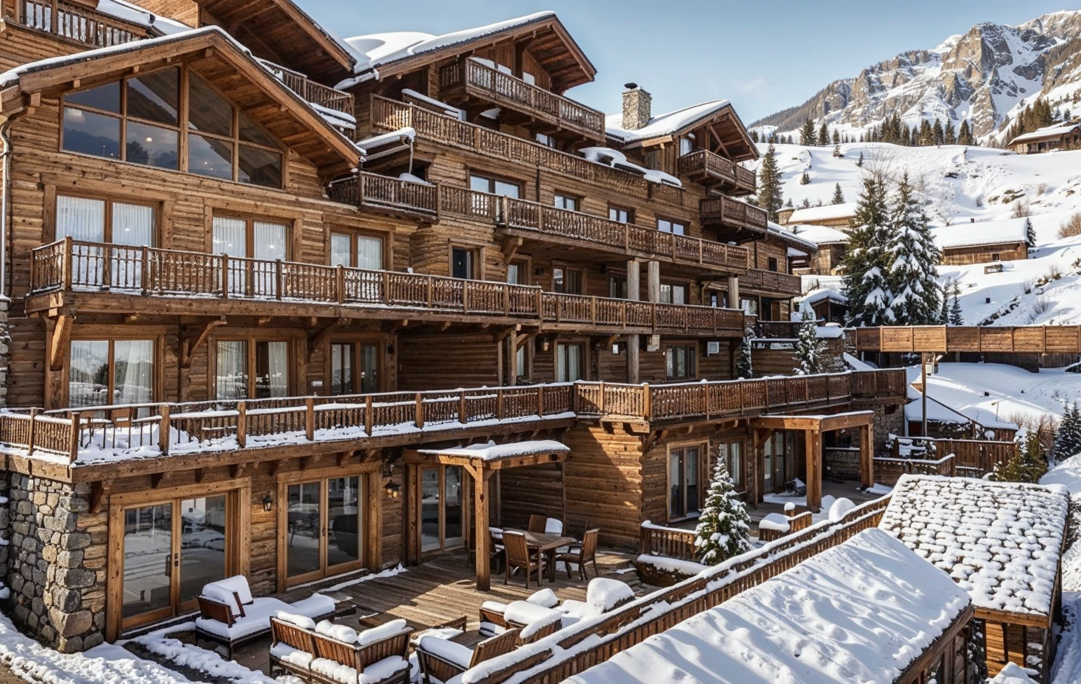 It is located in the heart of the Rond-Point des Pistes district, an exclusive and strategic location: the sunniest spots in the valley with private terraces, pedestrian access to shops, restaurants, and free shuttles serving the resort center.