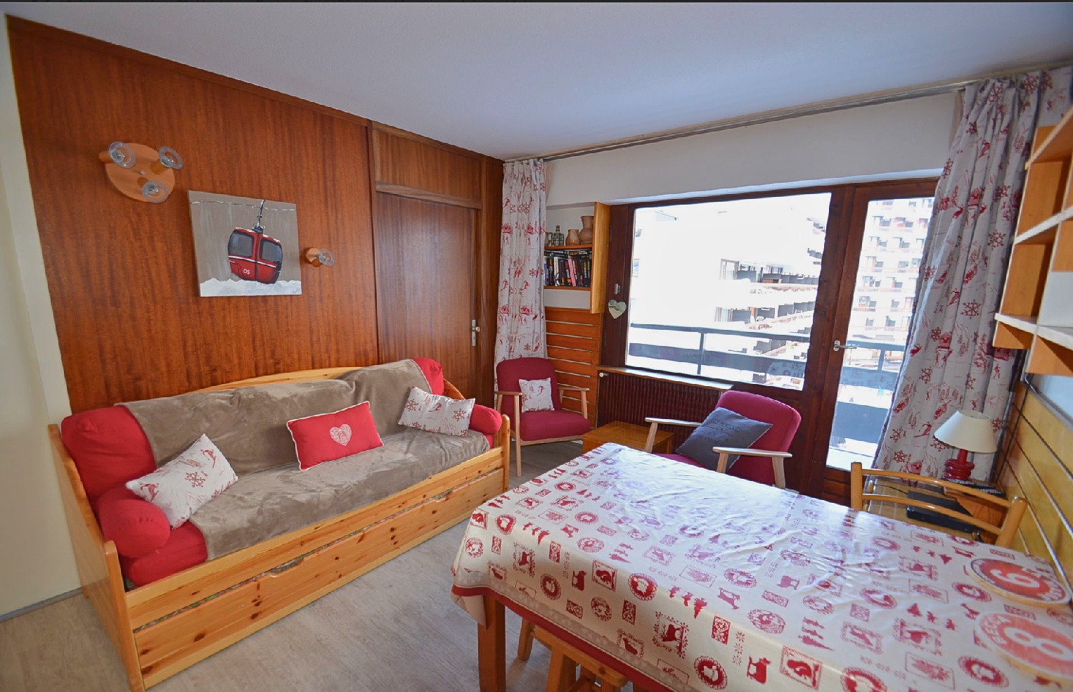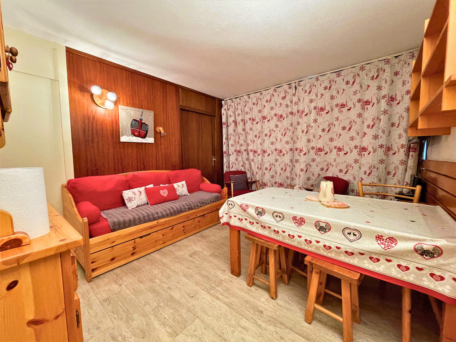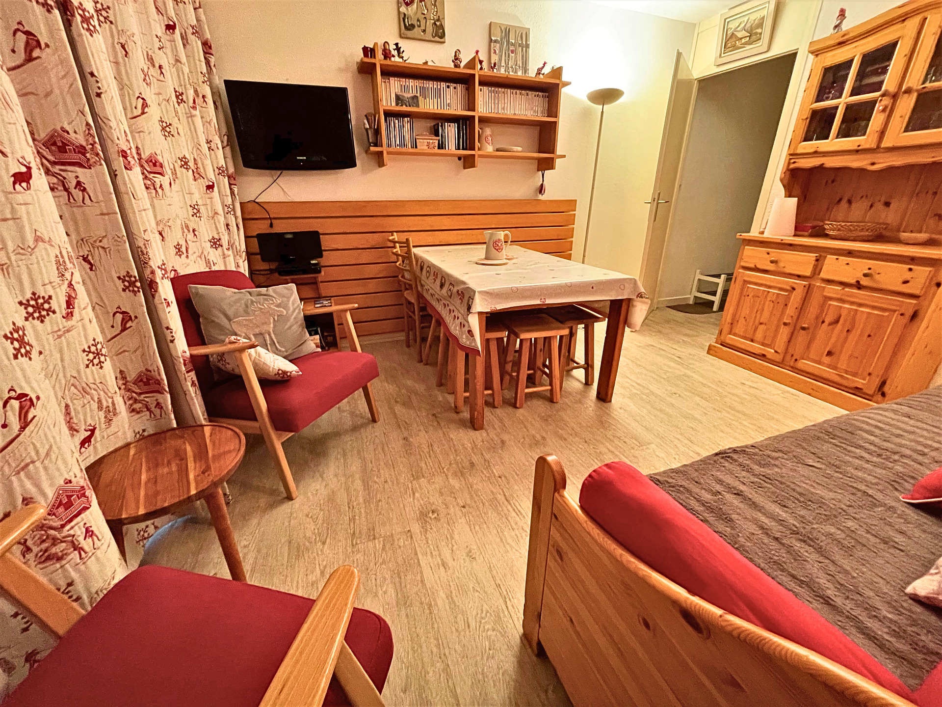 Living/dining room divisible by sliding partition: 1 single bed (90cm), 1 trundle bed (80cm), storage, television, DVD player, Bluetooth audio player