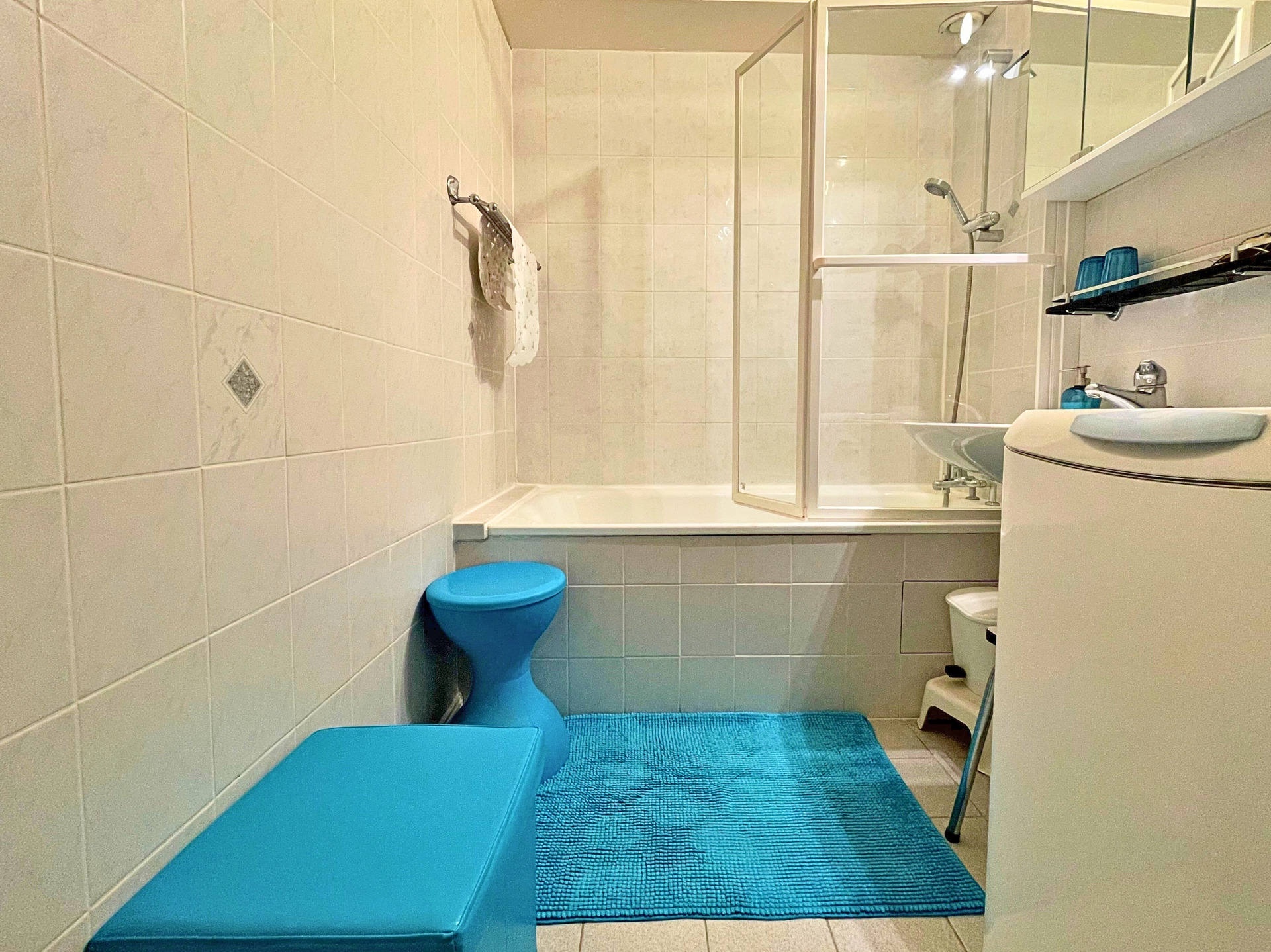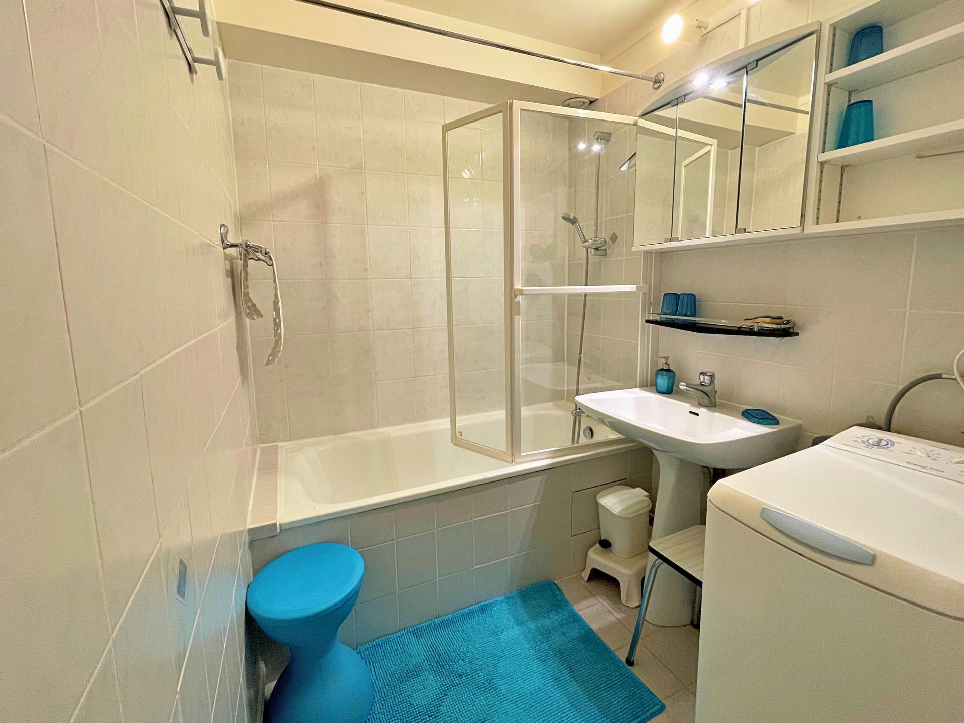 Bathroom: washbasin, bath, hair dryer