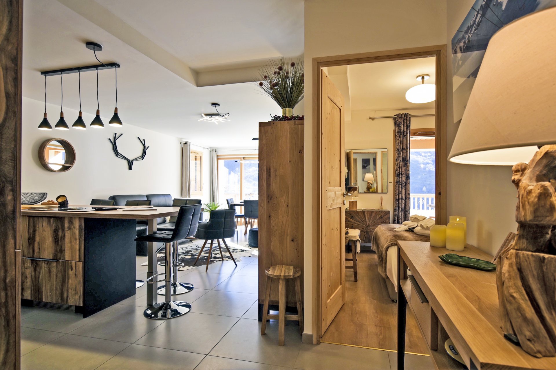 - A large living room opening onto the terrace, open kitchen