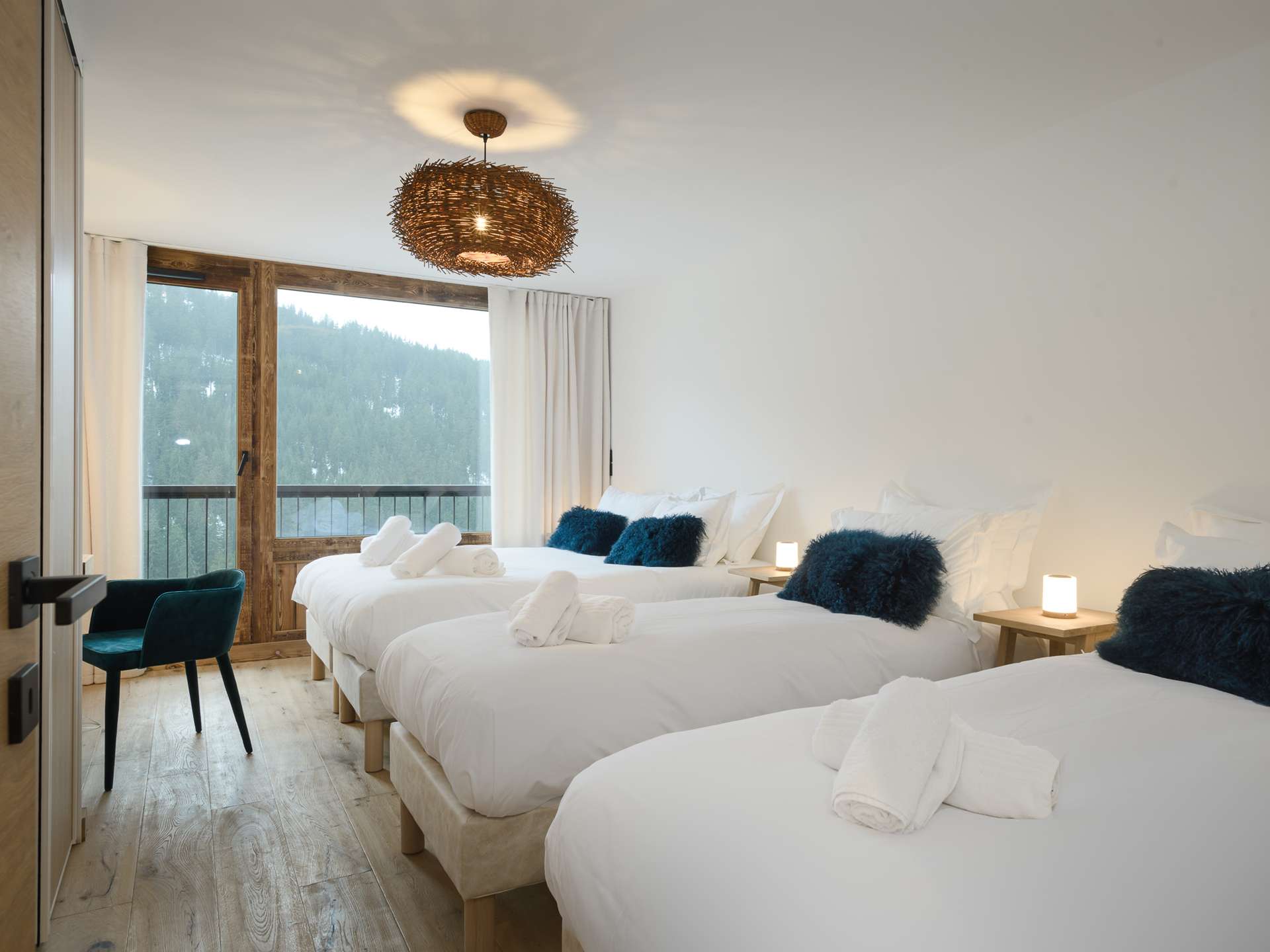 - Une chambre composée de 4 lits simples (80x200) ou 2 lits doubles (190x200), petit balcon, bureau et TV