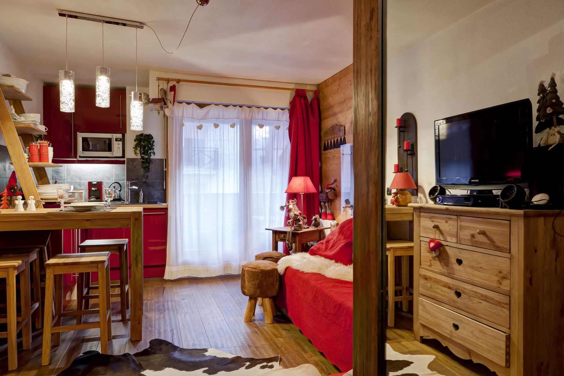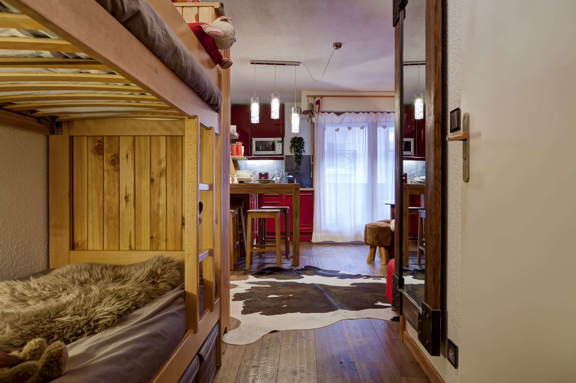 Studio avec coin montagne rénové dans un esprit montagne de charme classé 2* de 26m² exposé sud côté rue pour 4 personnes maximum au 2ème étage de la résidence avec ascenseur. Vue sur la rue commerçante de Brides les Bains, à proximité des restaurants.