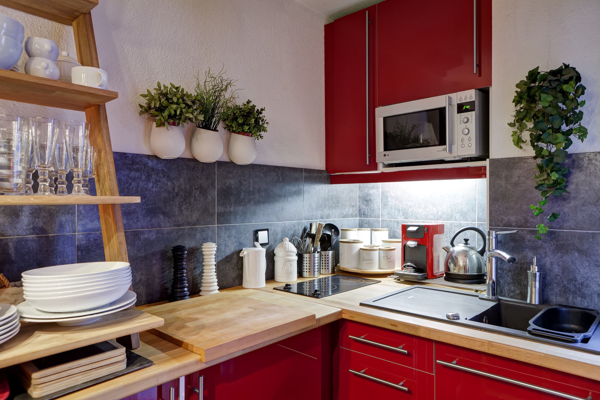 Cuisine dispose d'une table-bar avec tabourets hauts, plaques vitrocéramiques, combiné four/micro-ondes et réfrigérateur avec freezer.