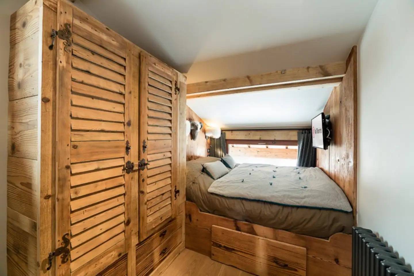 - une chambre avec lit queen size, rangements et TV,