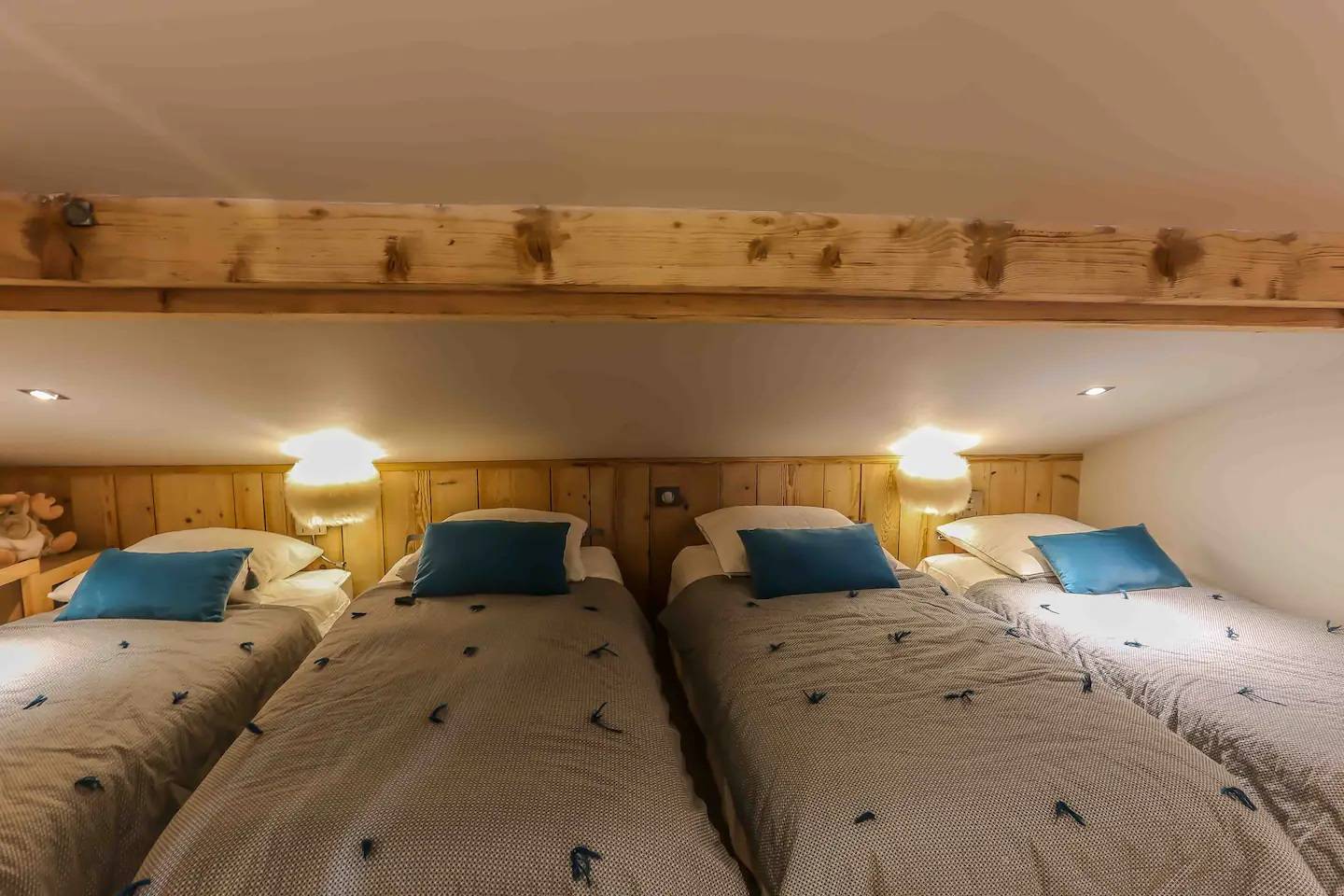 - un dortoir sous les toits, déconseillé aux adultes, avec 4 lits simples, une salle de bain avec une baignoire et un lavabo sur un meuble.