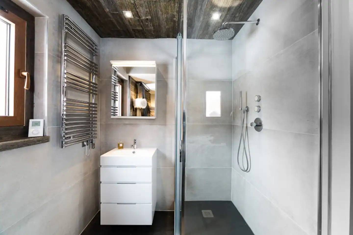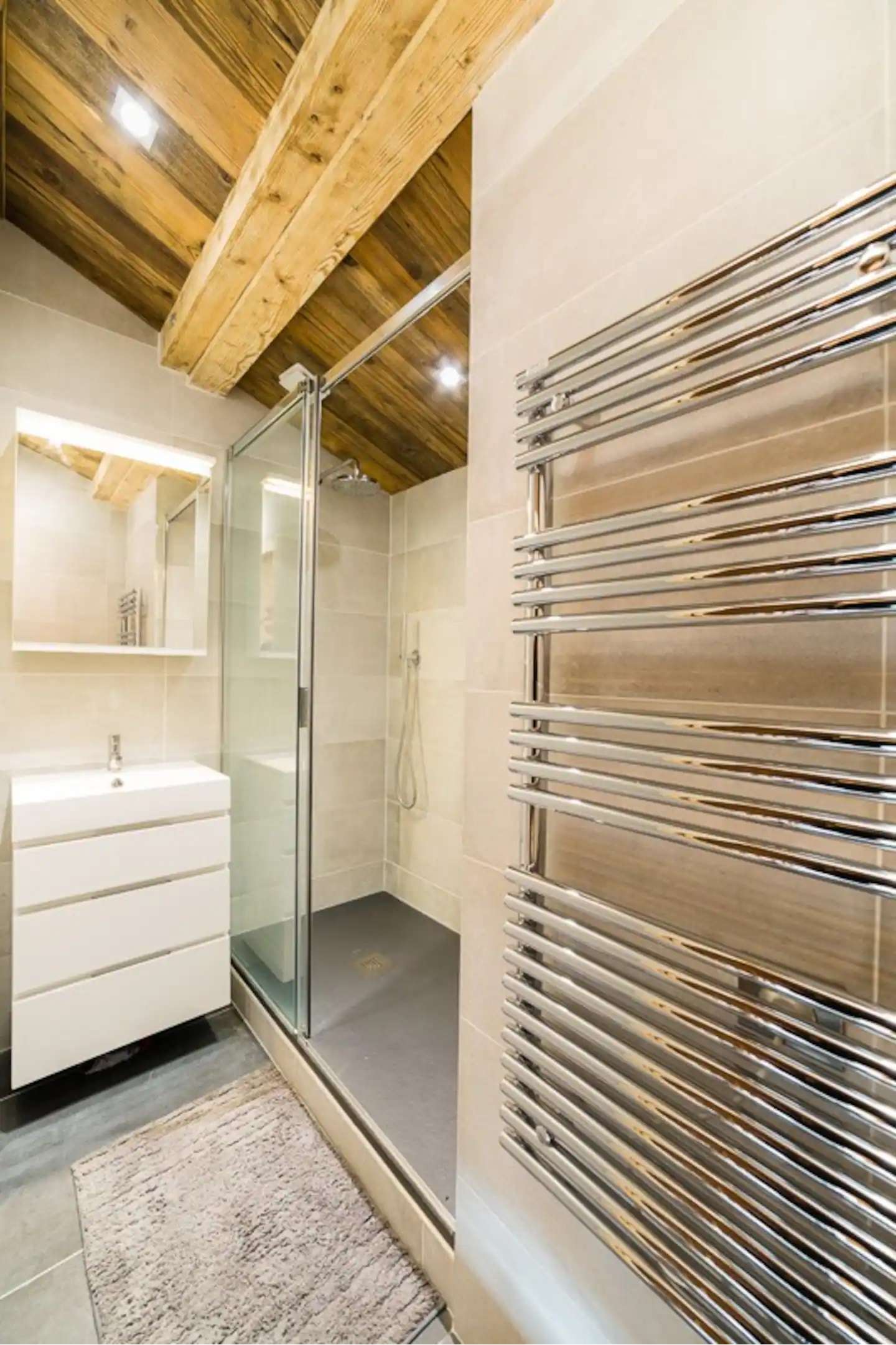- une salle d'eau avec douche et vasque sur meuble, sèche-serviettes.