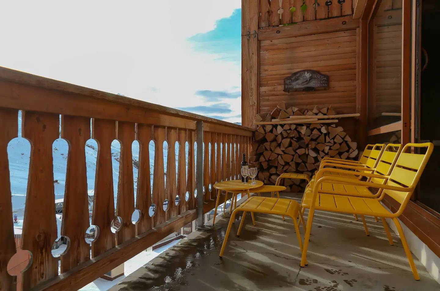 - Description: Grand balcon avec chaises longues, et salon de jardin avec vue imprenable sur les montagnes.