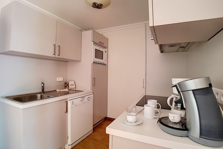 Cuisine ouverte équipée de 4 plaques induction, réfrigérateur, four, micro-ondes, lave-vaisselle.