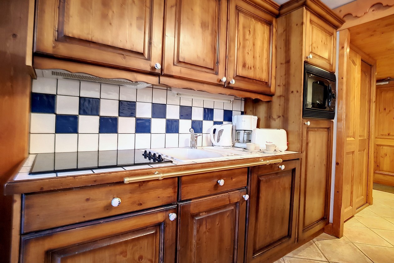 Cuisine équipée ouverte sur séjour : réfrigérateur, 4 plaques vitrocéramiques, combiné four / micro-ondes, lave-vaisselle, cafetière, grille-pain, bouilloire électrique.