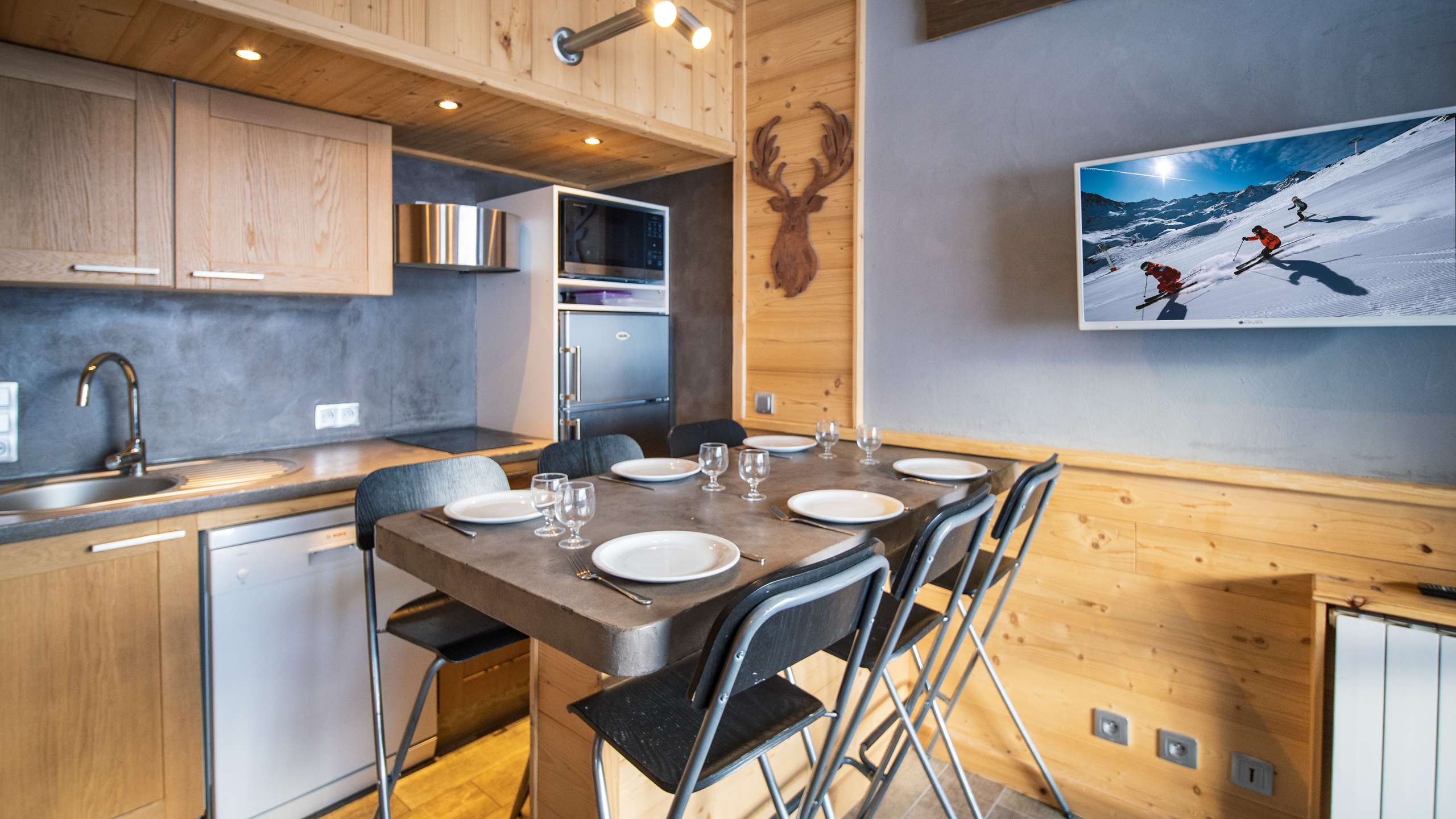 - Description: Cuisine ouverte équipée d'un micro-onde, lave-vaisselle, plaques de cuisson vitro-céramiques, réfrigérateur, cafetière Nespresso, grille-pain et bouilloire.