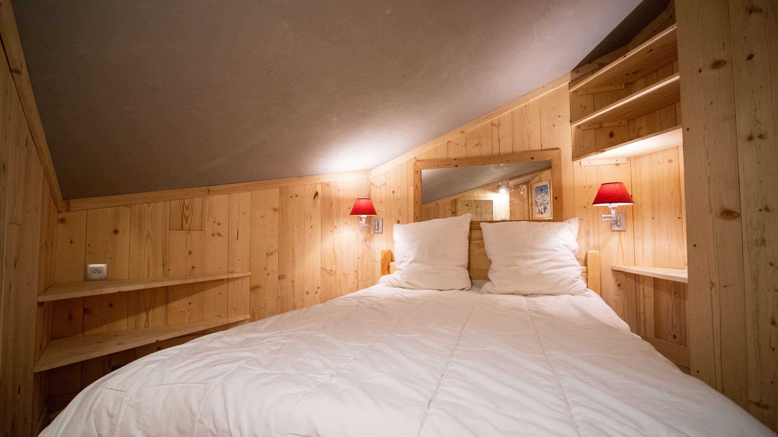 - Description: Chambre cabine avec un lit double (140/190). La hauteur sous plafond varie de part et d'autres du lit ( 150 à 178)