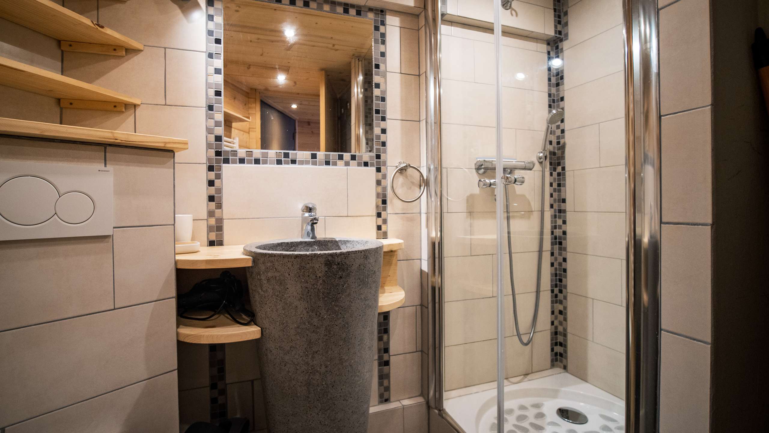 - Description: Salle de bain équipée d'une douche, d'un lavabo et d'un seche cheveux et le toilette.