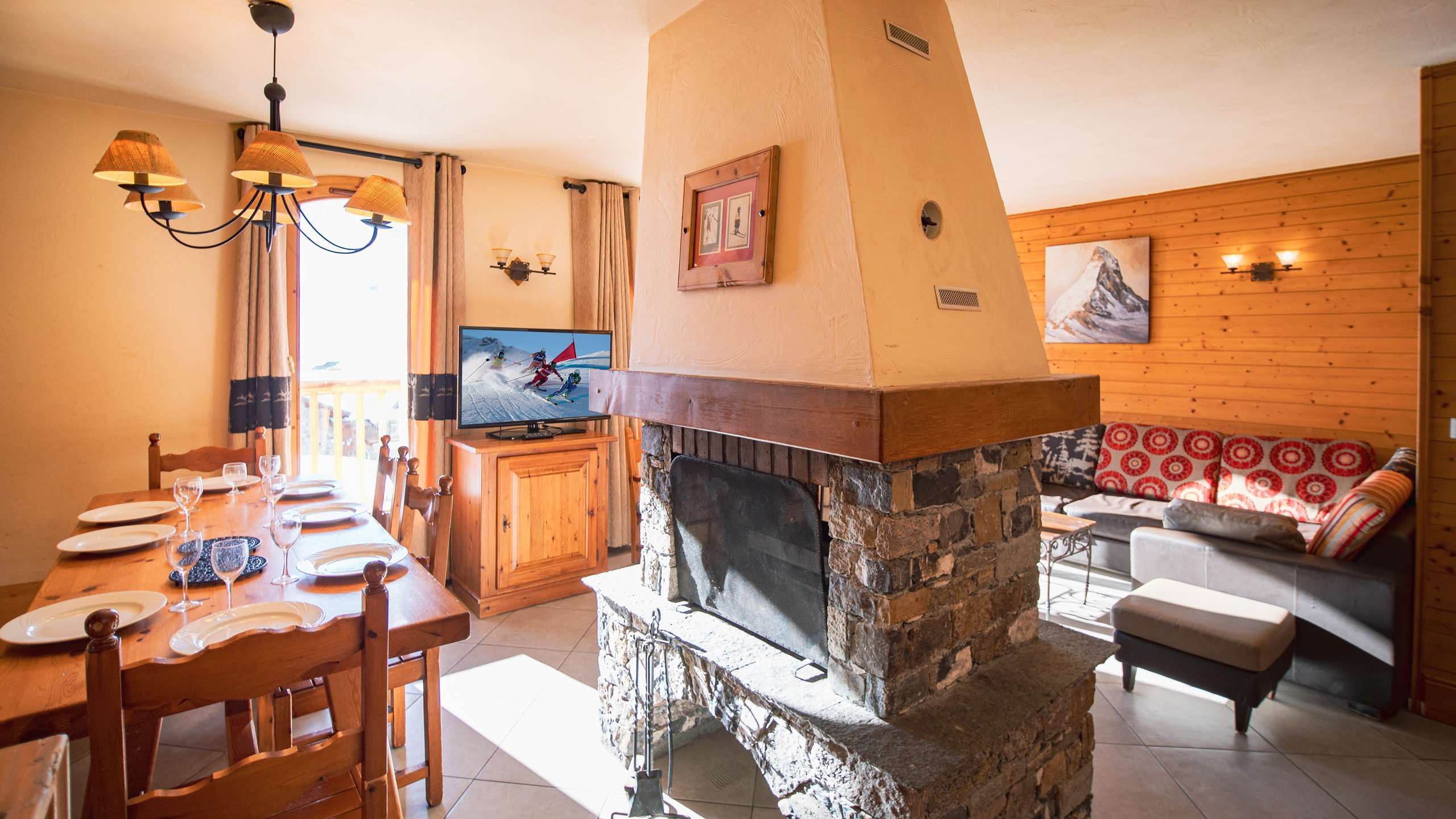 - Séjour équipé d’un canapé d'angle, d'une cheminée, d'une TV, et d'un coin repas avec 8 places assises.