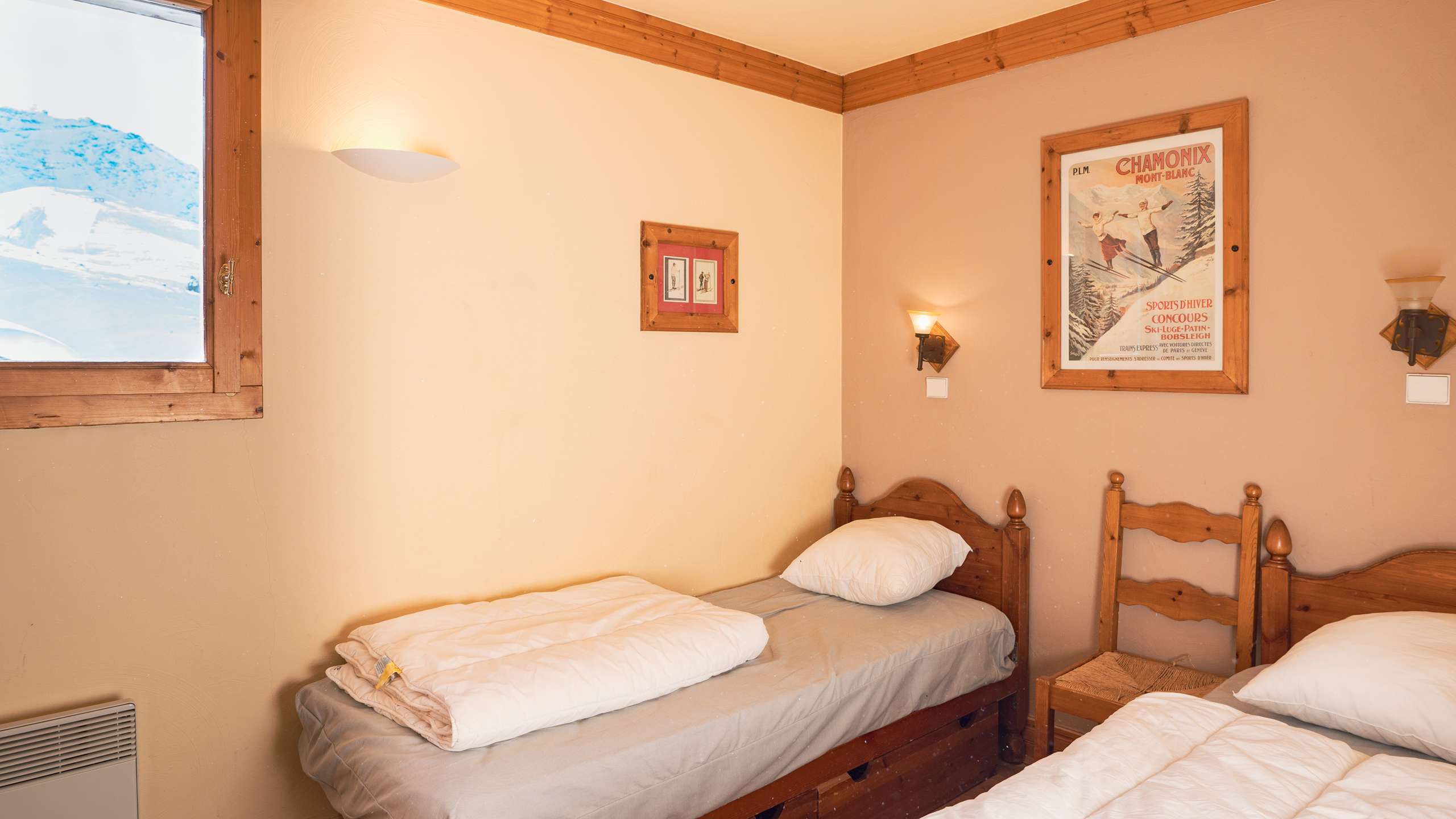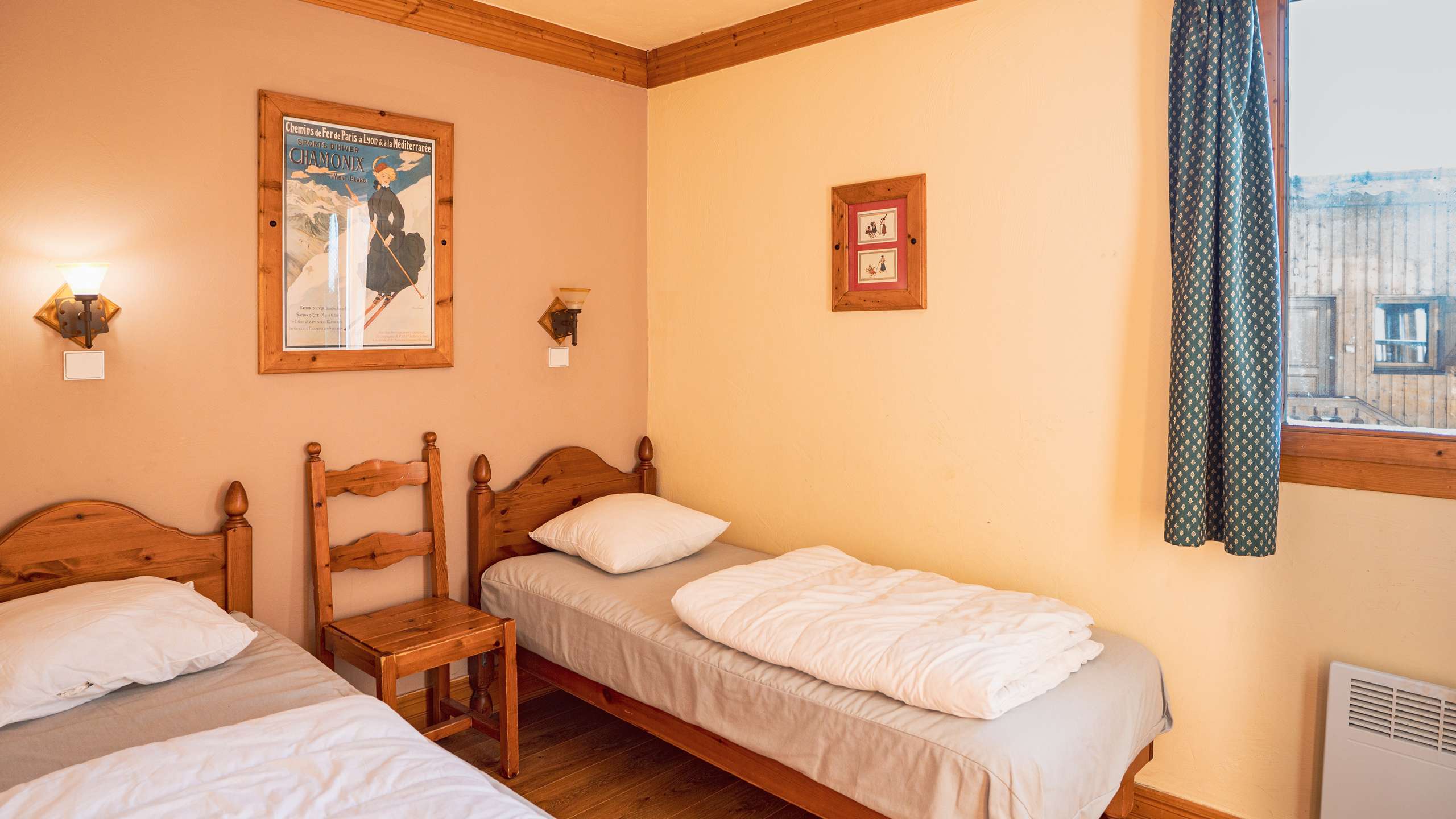 - Description: Chambre fermée par une porte avec 2 lits simples (90*190cm), équipés de couettes et d'oreillers carrés.